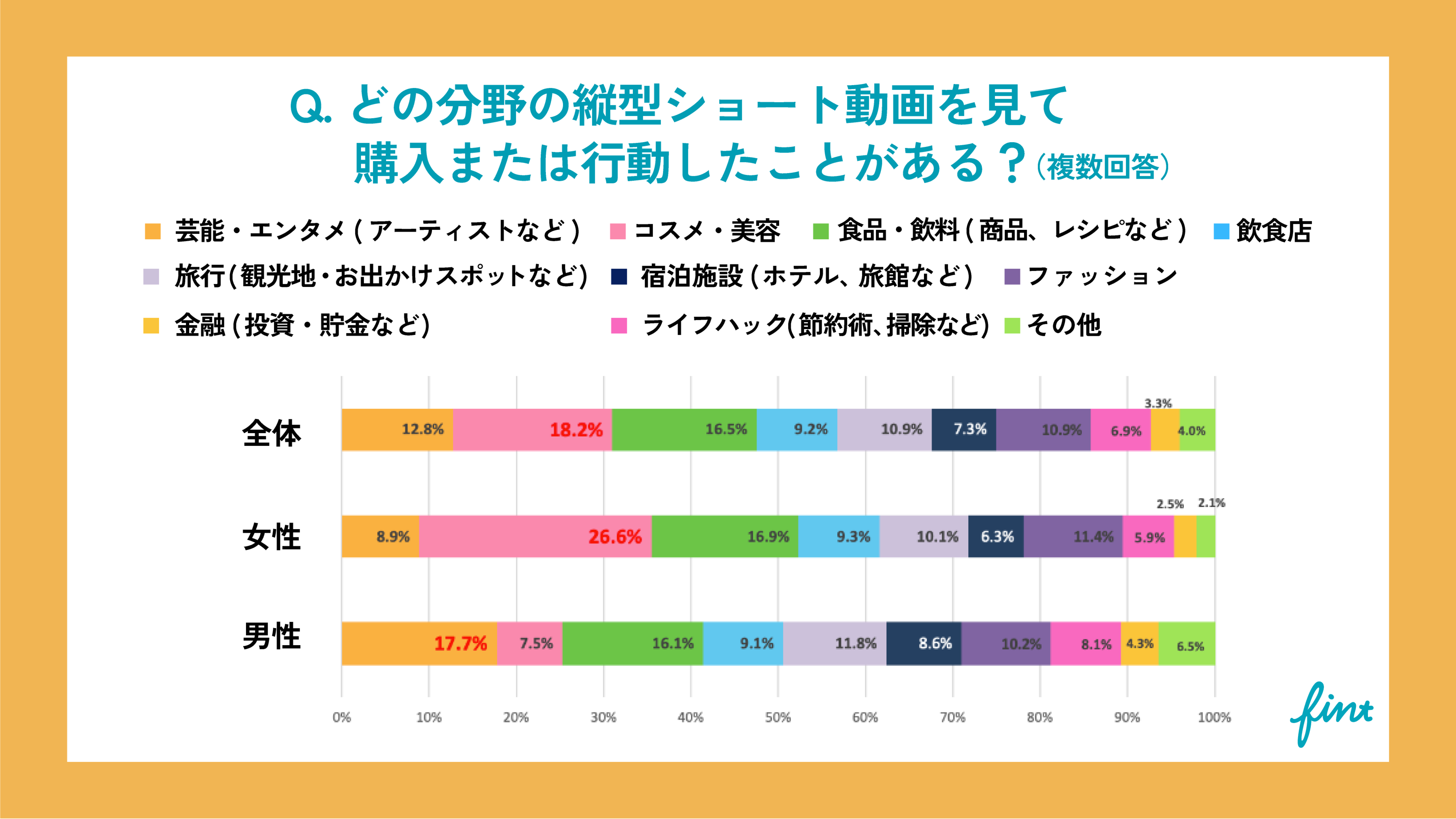 ●「どの分野の縦型ショート動画を見て、実際に購買したことまたは行動したことがある?」という質問に対し、【コスメ・美容】が18.2%で最も多い結果に。
