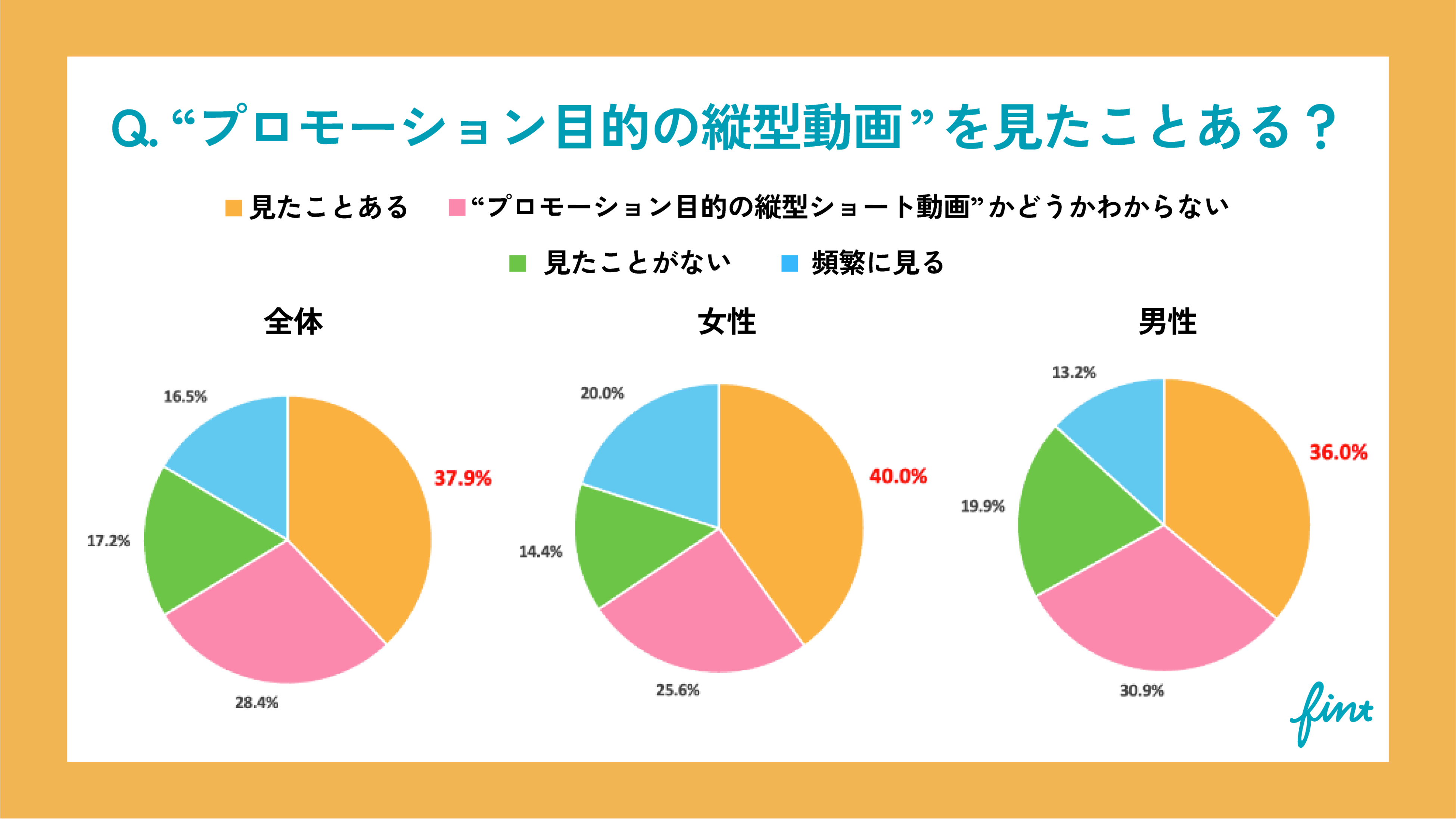 ●「プロモーション目的の縦型ショート動画を見たことがある?」という質問では、37.9%が【見たことがある】、次に28.4%が【“プロモーション目的の動画”かわからない】という回答が多かった。