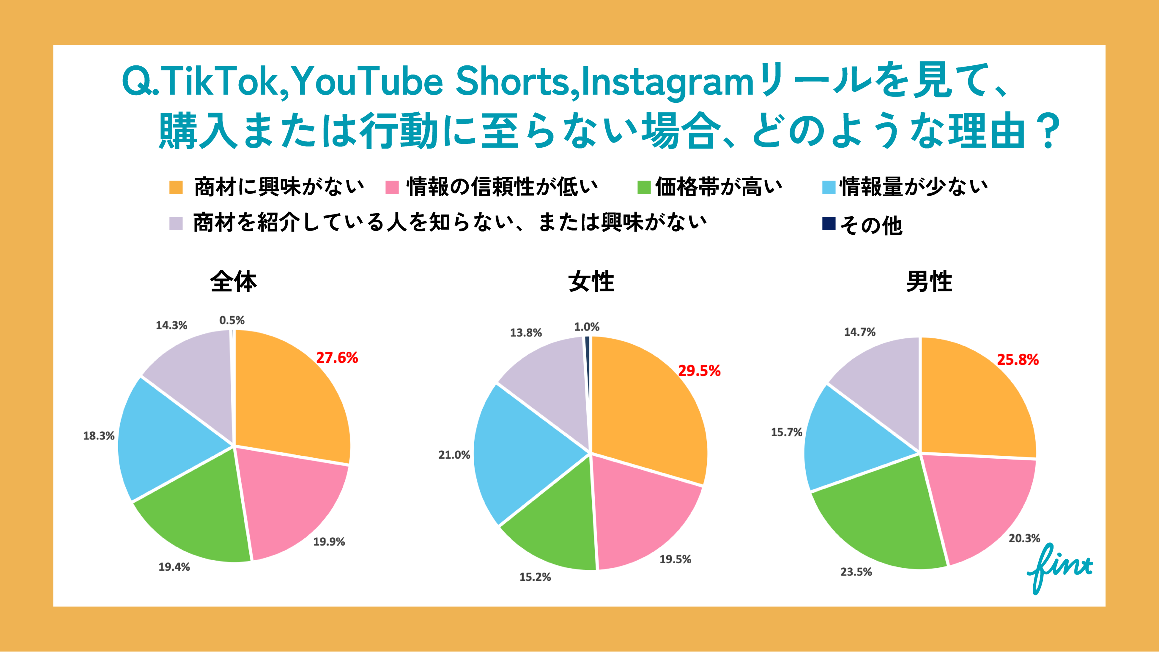 ●「TikTok・YouTube Shorts・Instagram リールを見て、購入または行動に至らない理由は?」という質問に対し、27.6%が【商材に興味がない】という理由で最も多い。