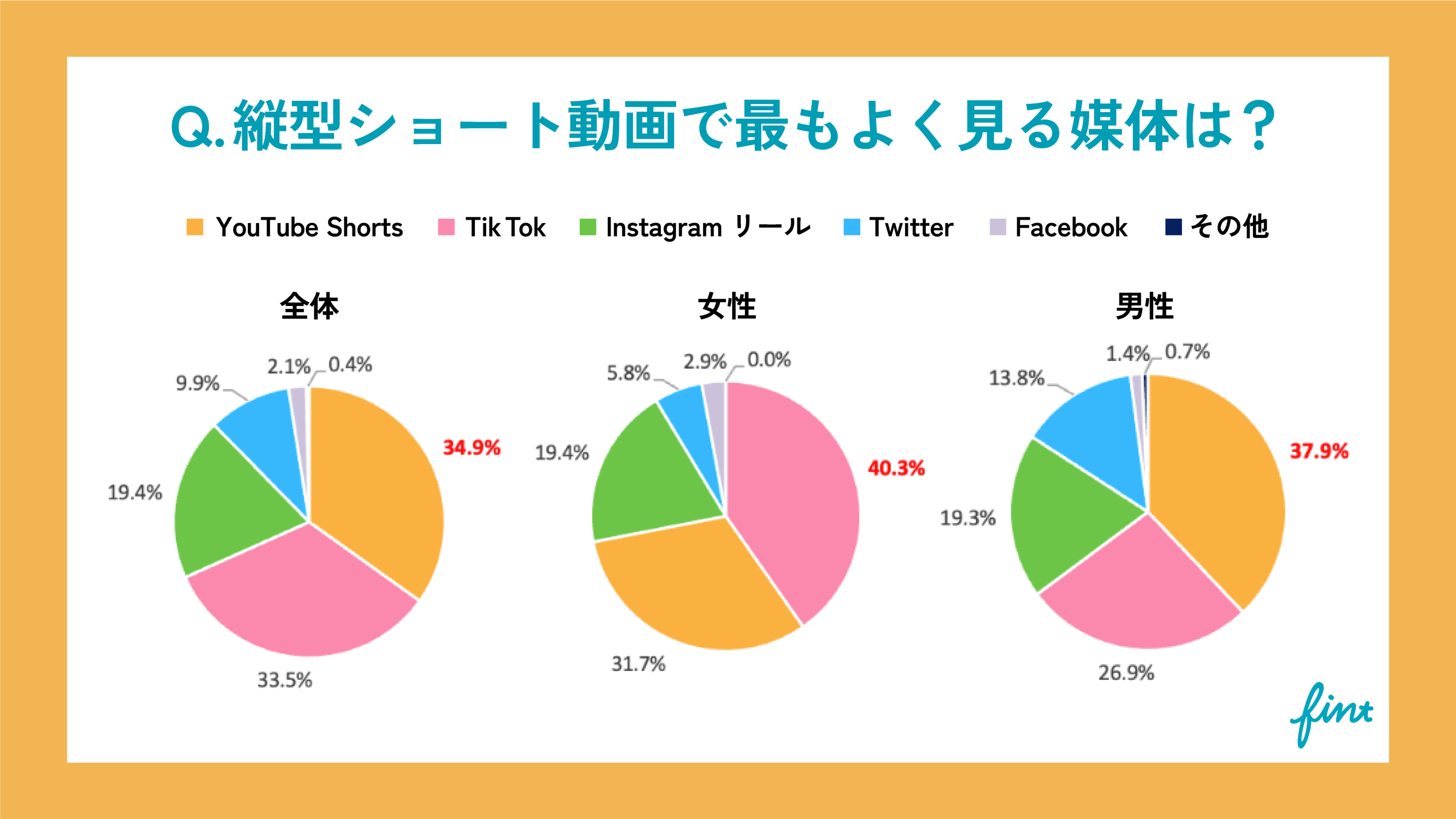 中でも、女性1位は40.3%が【TikTok】と回答している。また、【YouTube Shorts】は男女いずれも3割以上の得票で広く利用されていることがわかった。
