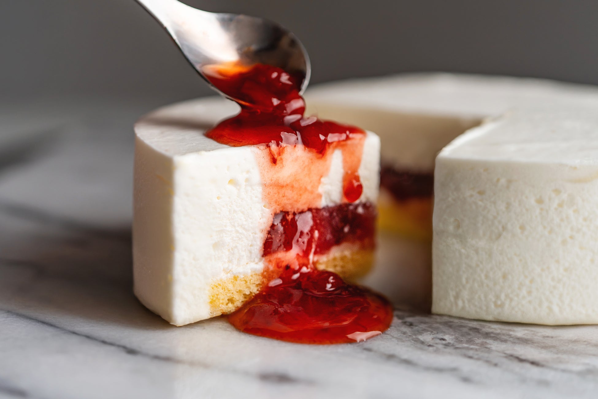 「ミガキイチゴのレアチーズケーキ」は、苺の蒸留酒に漬けた香り豊かなスポンジと、中に入っている程よく酸味を効かせた自家製のミガキイチゴのピューレが特徴です。メレンゲを抱き込ませてふんわり仕上げたムースはペロリと食べられる軽い味わいで、子供から大人まで家族みんなでお楽しみいただけます。