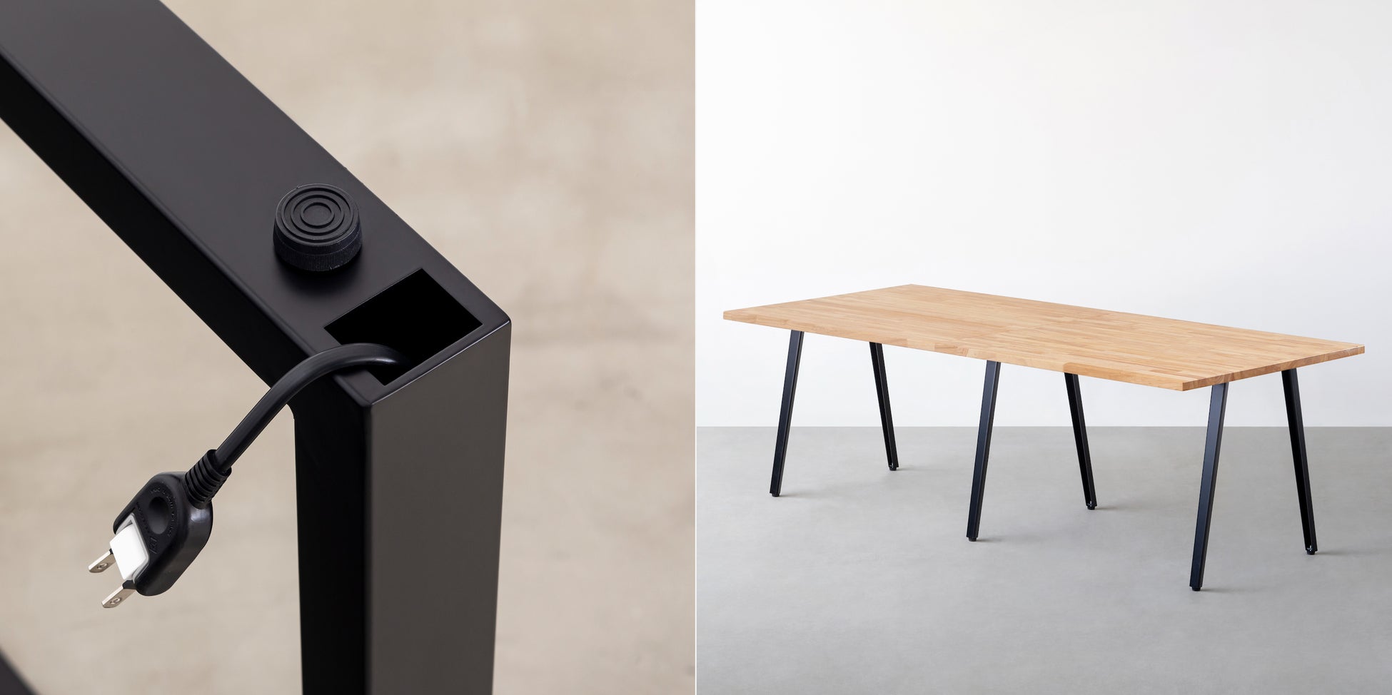 スクエア脚にコードやケーブル類を通せるよう上下に穴が空いている「配線孔付きスクエア」と、洗練された八の字のデザインで、短辺にもチェアを置ける「スリムライン」を追加しました。