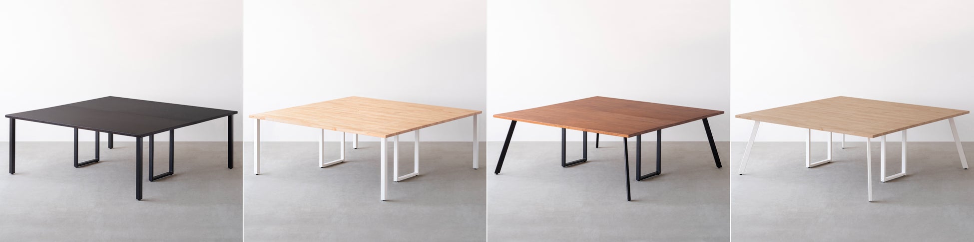 天板は定番のラバーウッド4色、テーブル脚にはSquare BarとTube Pinの2種類を展開。広々とした天板を支えながらも足元はシンプルで開放的な設計です。THE TABLEのすっきりとした見た目はそのままに、使い心地の良さを追求しました。