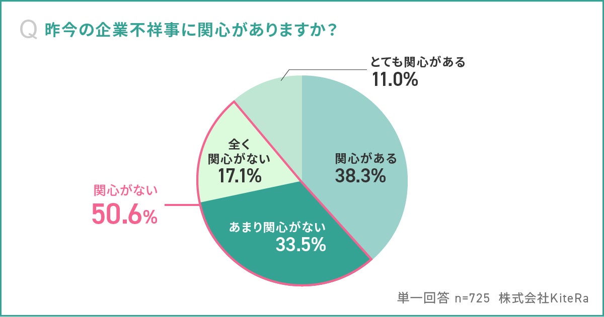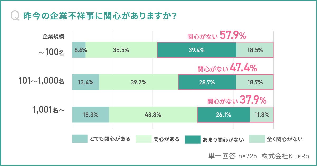 昨今の企業の不祥事に関して50.6%が「関心なし」。企業規模が大きくなるほど意識変容、1,000人超企業は関心度が顕著に上昇