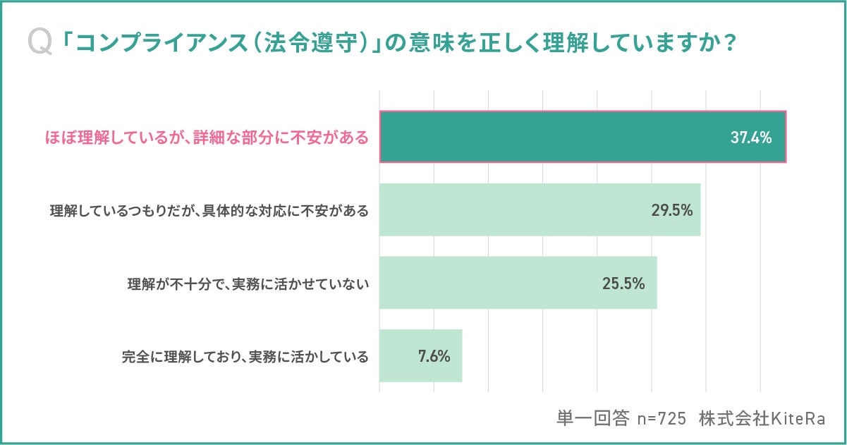 「コンプライアンス(法令遵守)の意味を正しく理解していますか。(単一回答)」と聞いたところ、「はい(ほぼ理解しているが、詳細な部分に不安がある)」が37.4%、「いいえ(理解しているつもりだが、具体的な対応に不安がある)」が29.5%、「いいえ(理解が不十分で、実務に活かせていない)」が25.5%、「はい(完全に理解しており、実務に活かしている)」が7.6%という結果となりました。
