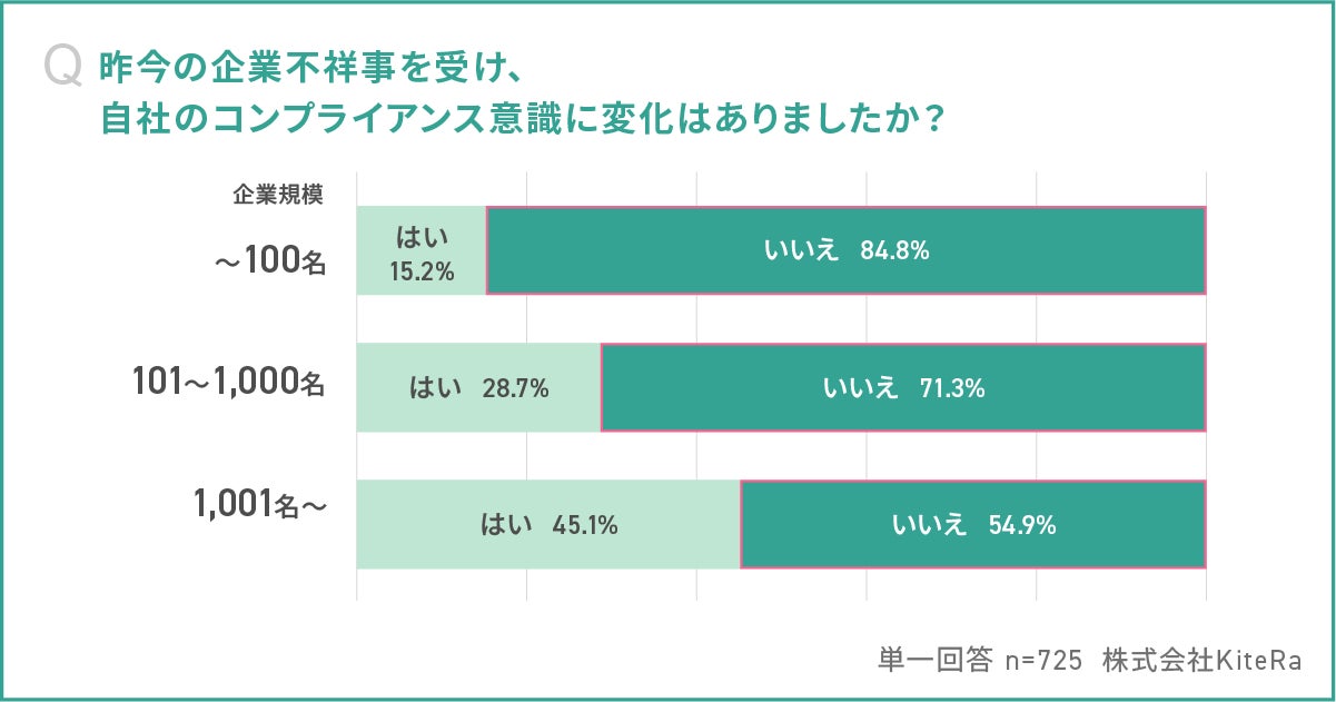 74.6%が、昨今の企業の不祥事を受けて、自社のコンプライアンスに関する “意識の変化はない” と回答。規模で二分化、1,000名超企業では半数近くが「変化あり」と回答、コンプライアンス意識に顕著な温度差