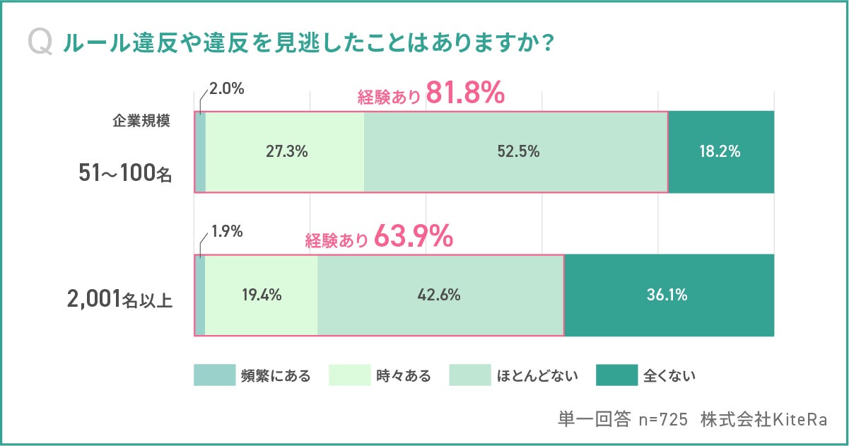 両者間で17.9ポイントの乖離が見られ、企業規模が大きいほど、ルール違反の経験がないと回答する割合が高い傾向が示されました。