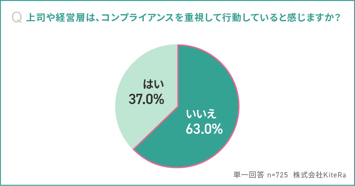 「上司や経営層は、コンプライアンスを重視して行動していると感じますか。(単一回答)」と聞いたところ、「いいえ」が63.0%、「はい」が37.0%という結果となりました。