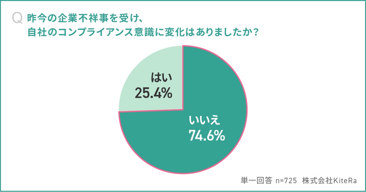 「昨今の企業の不祥事を受けて、貴社ではコンプライアンスに関する意識の変化はありましたか。(単一回答)」と聞いたところ、「いいえ」が74.6%、「はい」が25.4%という結果となりました。