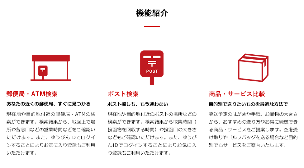 初めてポストの位置情報が見れるようになったり、郵便局に行く前に整理券を発行し時間を有効活用いただけるなど便利なサービスをご提供していますので、ぜひご利用ください。