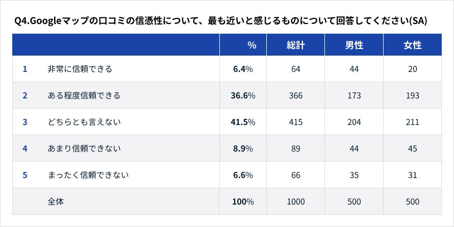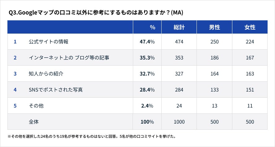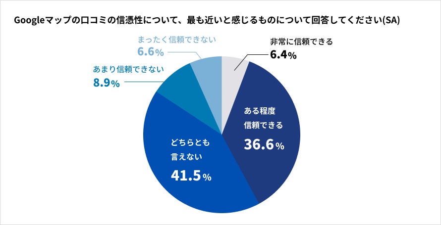 インターネットユーザーの約半分が、Googleマップの口コミを参考程度にしか確認しない。Googleマップの口コミ以外では、公式サイトの情報が最も信頼されている。