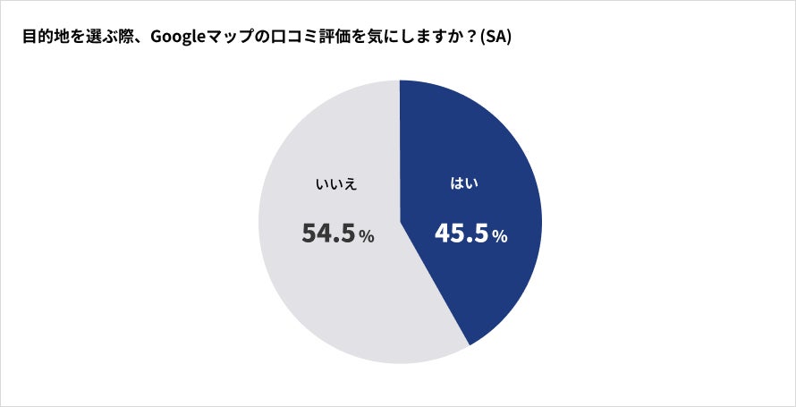 約半数(45.5%)が目的地選びでGoogleマップの口コミを気にしますが、半数以上(54.5%)は気にしないという結果です。意外にも口コミを参考にしない人が多いことが分かります。