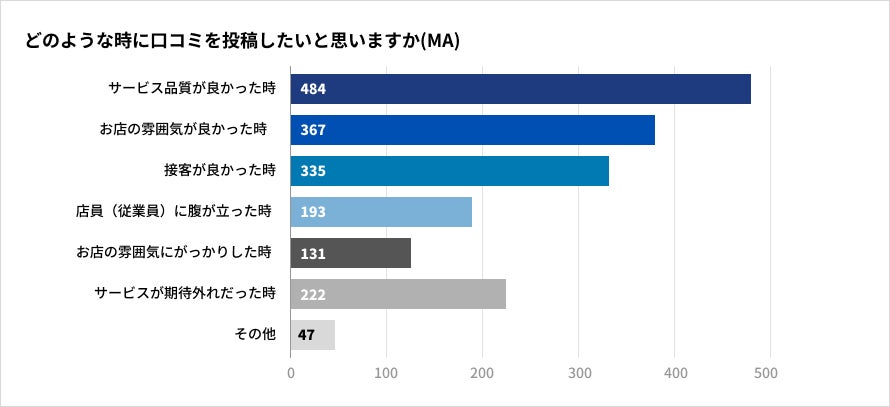 「お店の雰囲気が良かった時」「接客が良かった時」も上位です。五感で感じる体験が口コミにつながりやすいです。