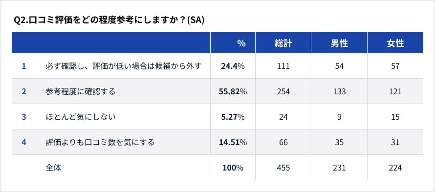 「ほとんど気にしない」「評価よりも口コミ数を気にする」人は少数派です。口コミを気にするものの、過度に依存するわけではない様子が伺えます。