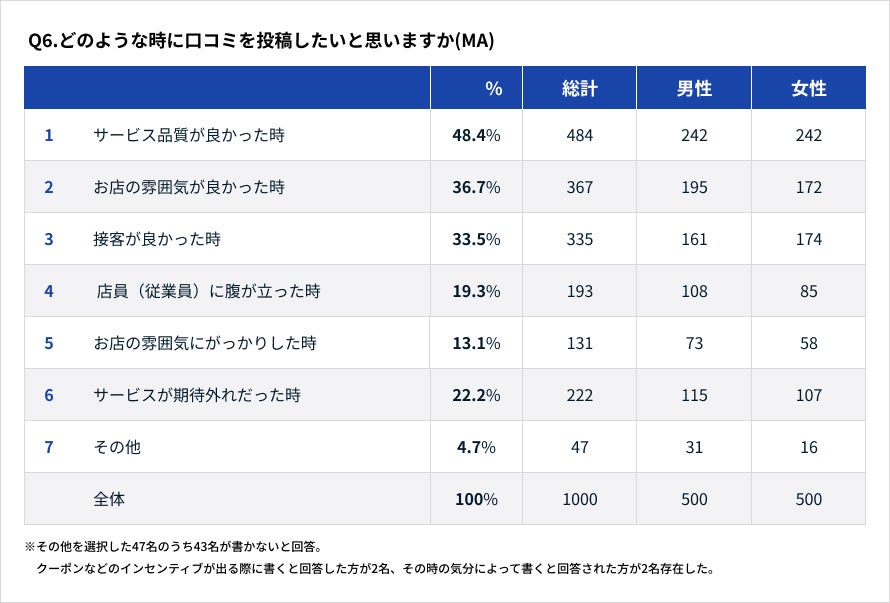 「サービス品質が良かった時」が全体の約48%で最多です。ポジティブな口コミはサービス体験に大きく影響されます。