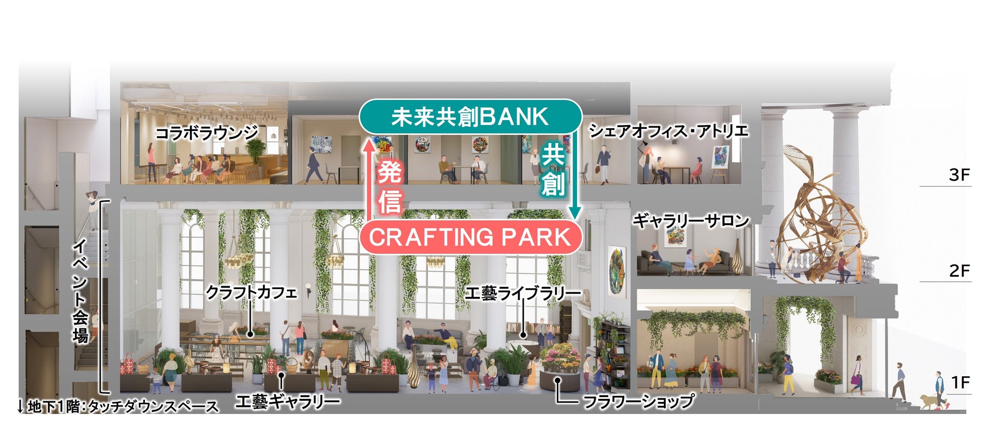 象徴的な吹き抜け空間を持つ1階には、文化・芸術・観光の発信拠点「CRAFTING PARK」として、世界各地の工藝作品や商品を集積させる工藝ギャラリー、カフェ、フラワーショップ、ライブラリーを、2階バルコニー側にはバルコニーと一体的に活用できるギャラリーサロンを設けます。
