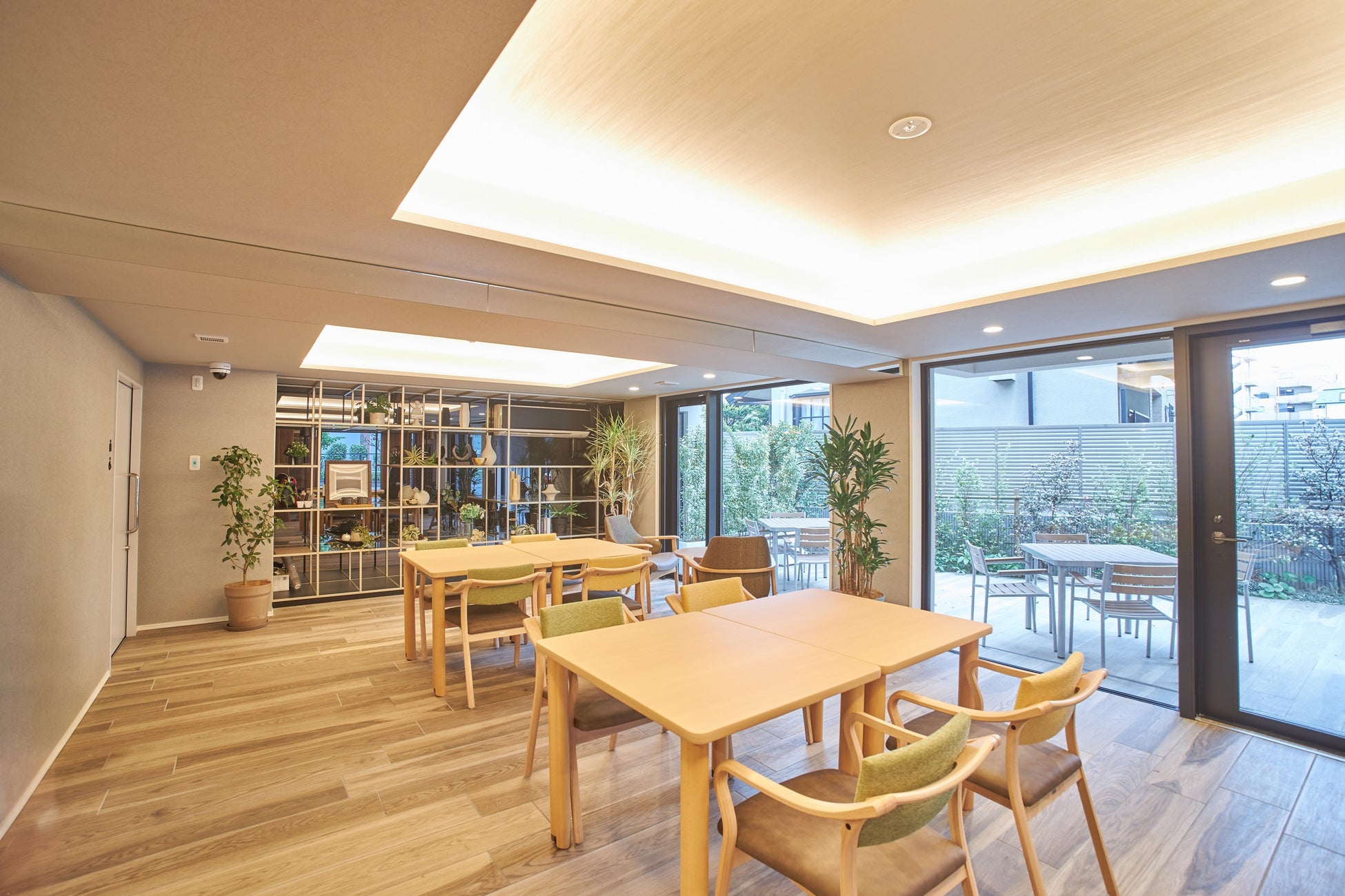 また、1階には皆様が思い思いに時間を過ごせる「庭カフェ」があります。ゆったりとしたソファやテーブルが置かれ、緑を多く配した居心地の良い空間で、コーヒーを飲みながら、読書やおしゃべりを楽しんだりすることができます。