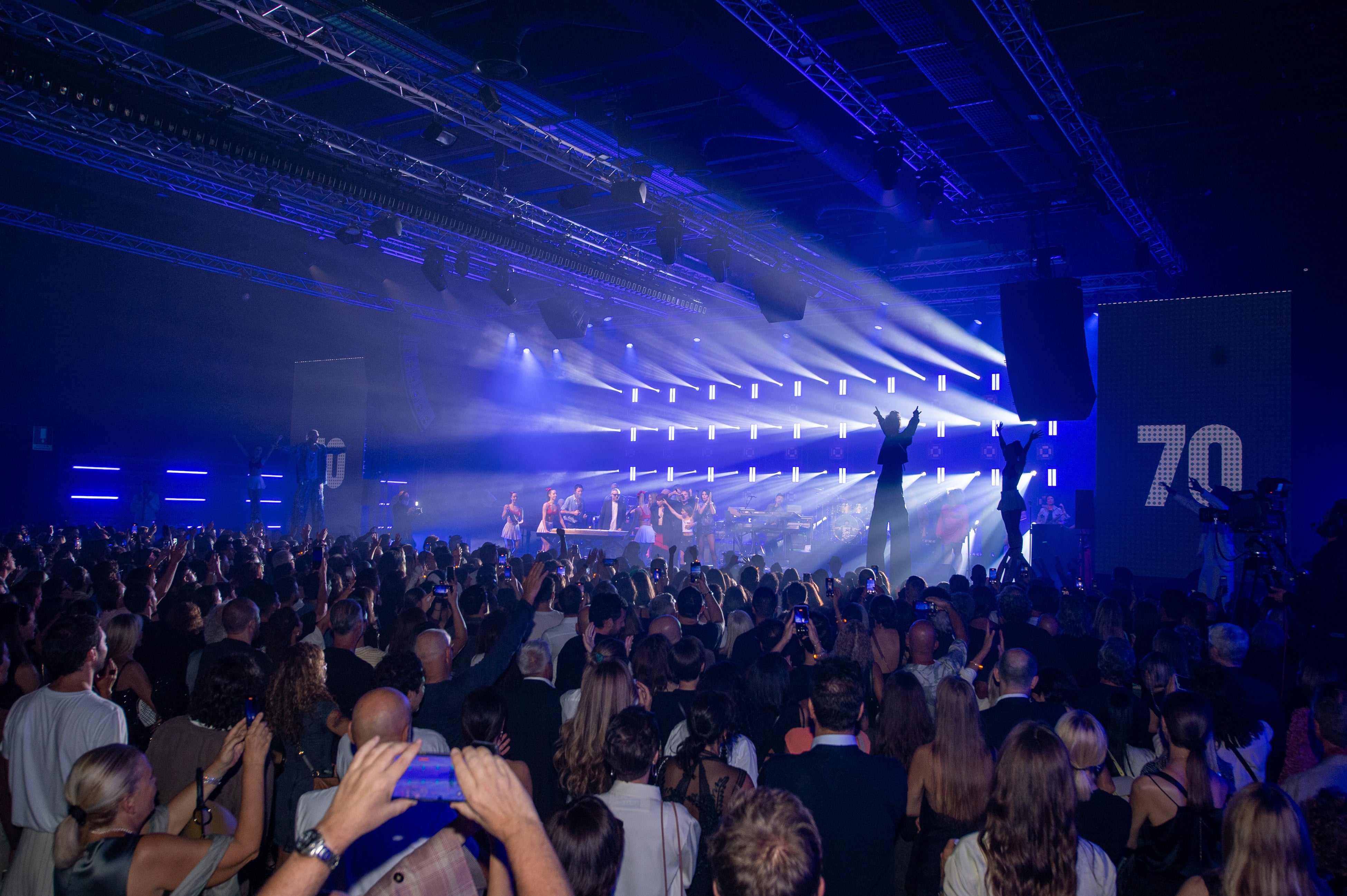 会場では、レンツォ・ロッソに捧げられたコンサートが行われ、イタリアを代表するシンガーであるジョヴァノッティをはじめ、複数のアーティストが次々とステージに登場しパフォーマンスを披露しました。さらに、キャンパス各所に設けられたDJブース、グループ各ブランドのカスタム衣装をまとったダンサーやサーカスパフォーマーによる演出、光のインスタレーションや大型スクリーンを駆使した映像演出、そして生演奏など、多彩なエンターテインメントがゲストを楽しませました。