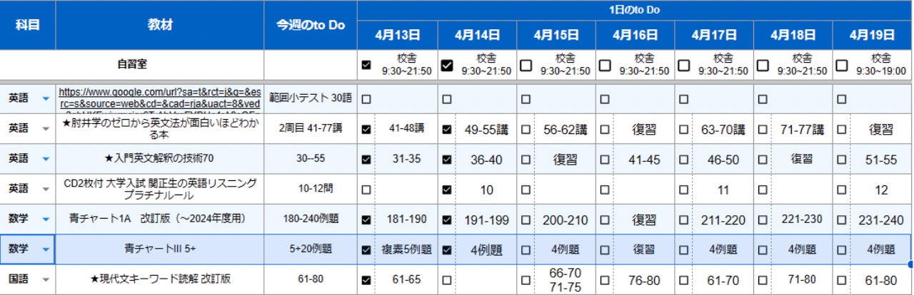 作成した週間学習計画表は、1日単位でやるべきことがリスト化され、登校時間も明記されています。それを基に、その日の目標が達成できているかを毎日確認し、計画通りに勉強を進めるよう徹底管理いたします。