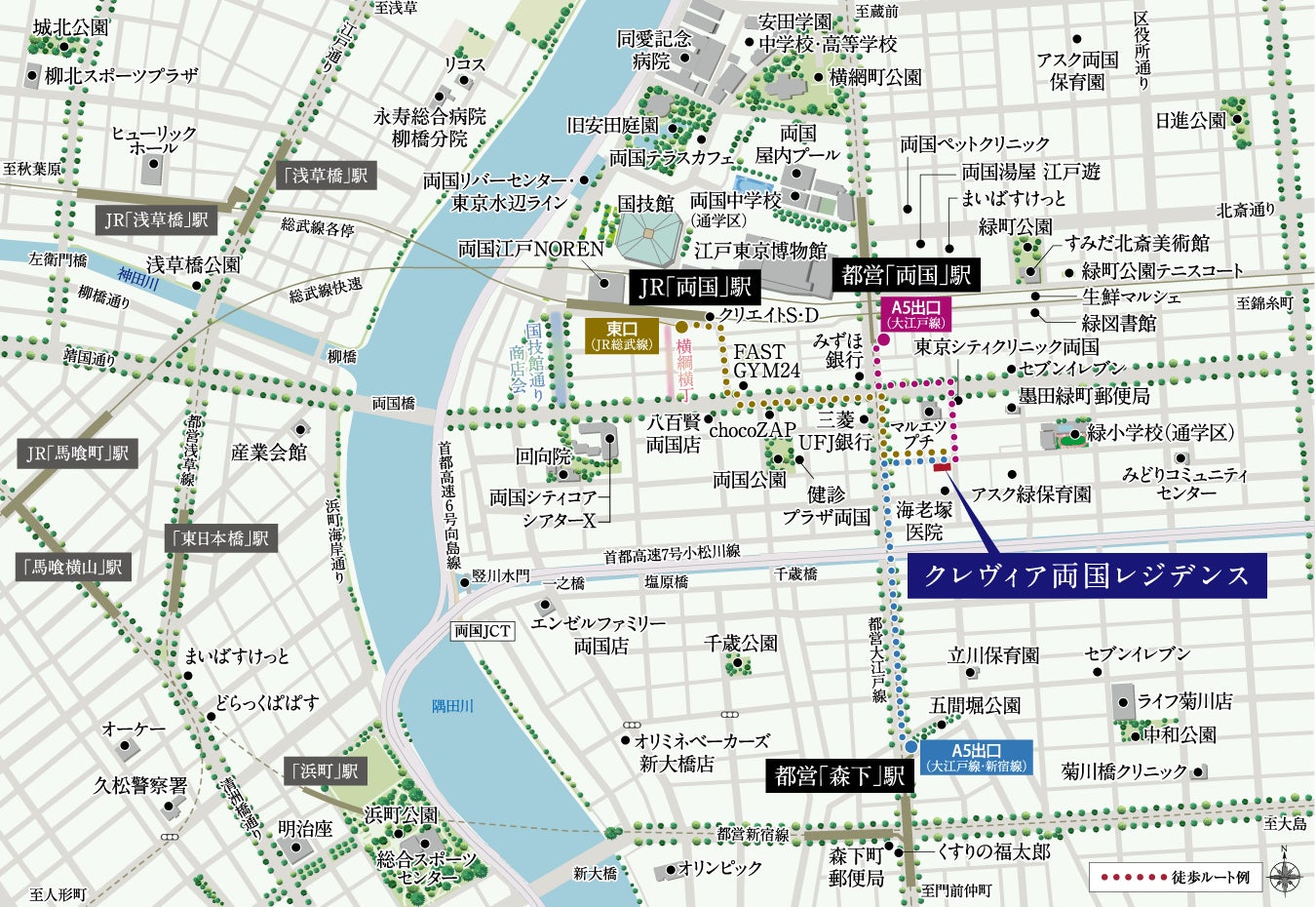 「クレヴィア両国レジデンス」は、都営大江戸線「両国」駅徒歩4分、都営新宿線「森下」駅徒歩7分、JR中央・総武線「両国」駅徒歩9分のフラットアプローチに位置し、2駅3路線利用可能です。