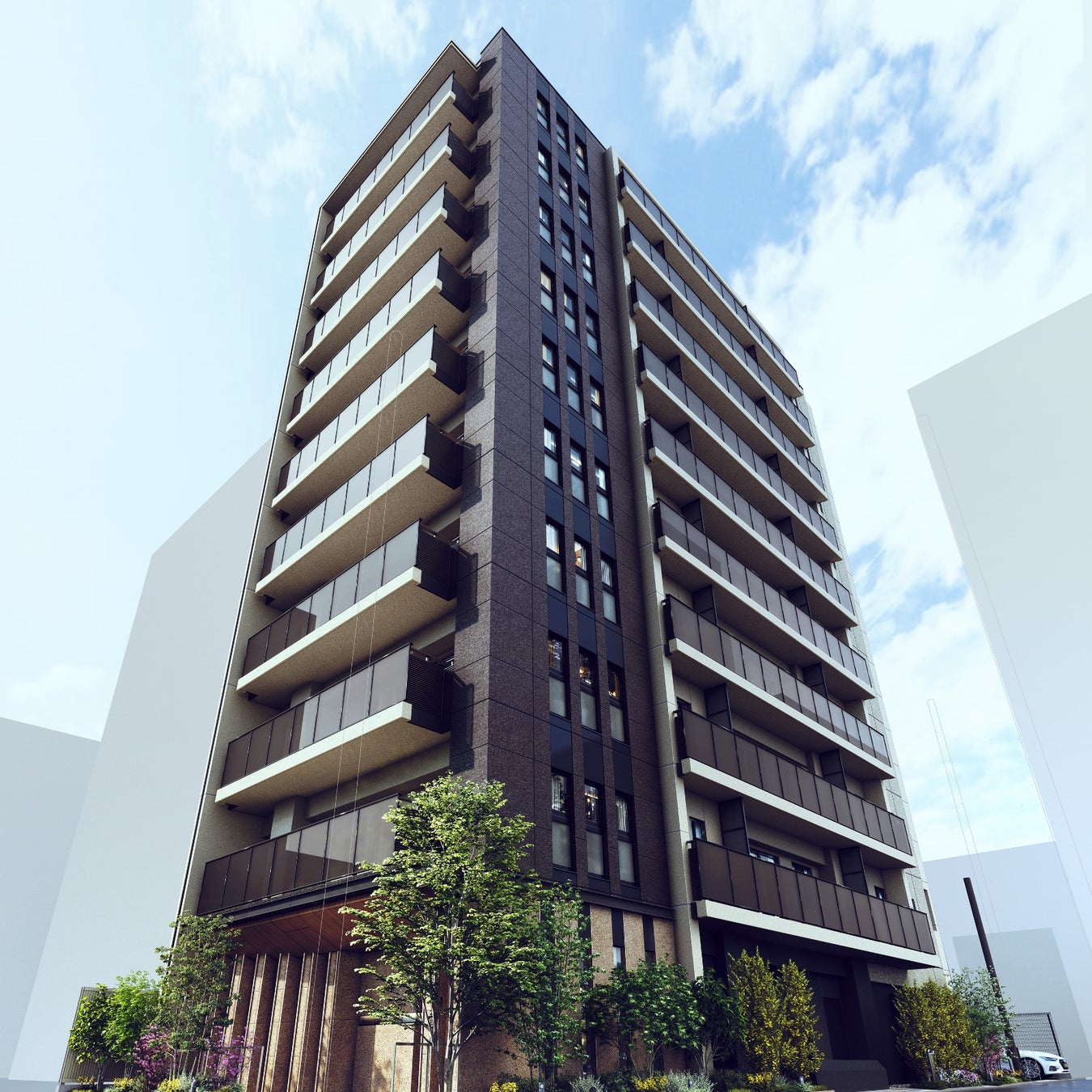 ※掲載の完成予想CGは、計画段階の図面を基に描き起こしたもので、形状・色彩・外構・植栽等は実際とは異なります。形状の細部・設備機器・配管等は省略または簡略化の上、表現しております。今後、行政指導・施工上の理由等により、計画に変更が生じる場合があります。樹木・植栽は、特定の季節やご入居時の状態を想定して描かれたものではありません。実際に植樹する樹形・枝ぶり・葉や色合い等が異なる場合があります。尚、竣工時には完成予想CG程度には成長しておりません。周辺の建物、電柱、電線、ガードレール等は省略・簡略化して表現しています。
