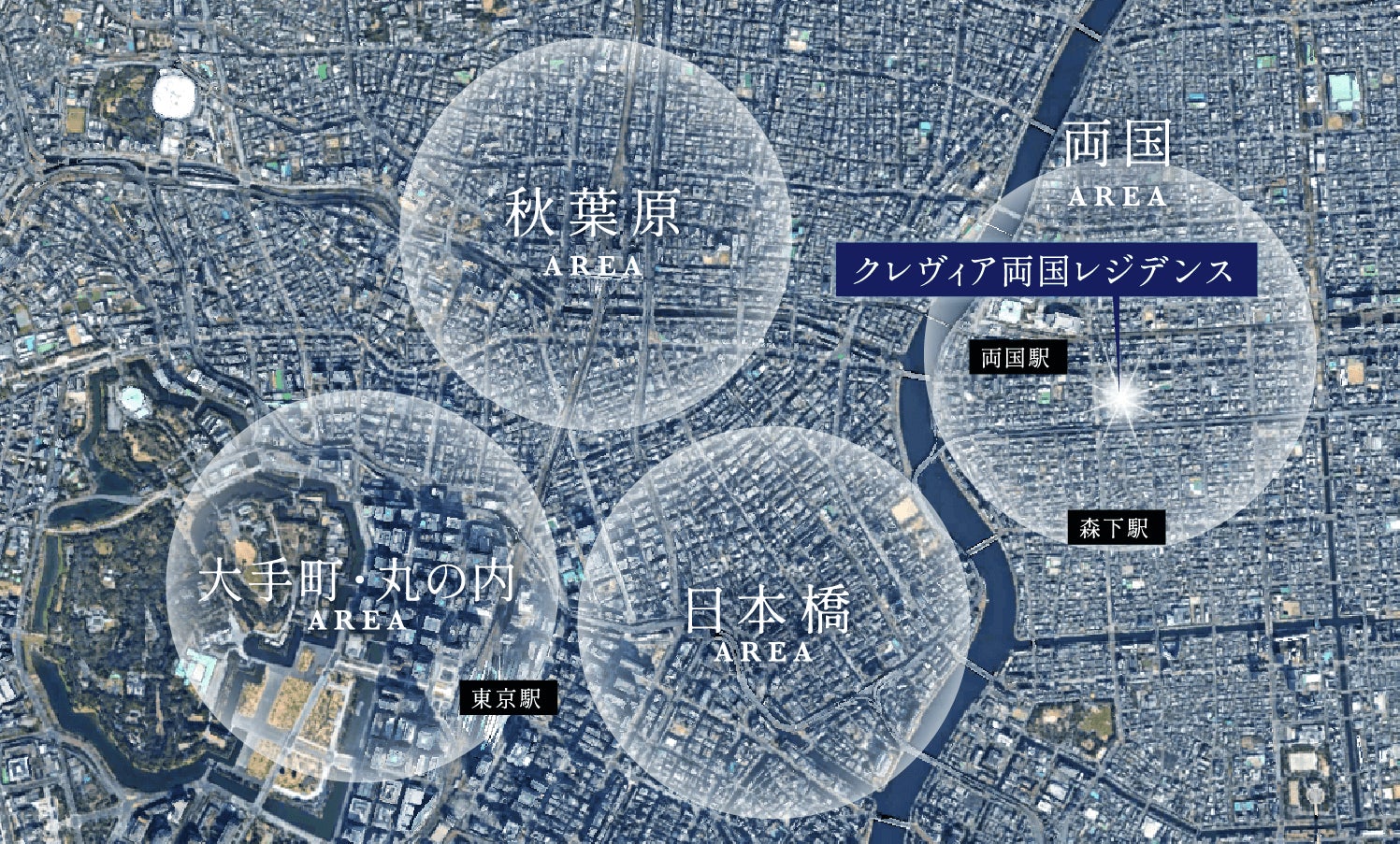 東京駅3km圏である両国駅は、秋葉原駅へ4分、東京駅へ12分、新宿駅へ18分でアクセスでき、日本橋や大手町なども身近なエリアです。