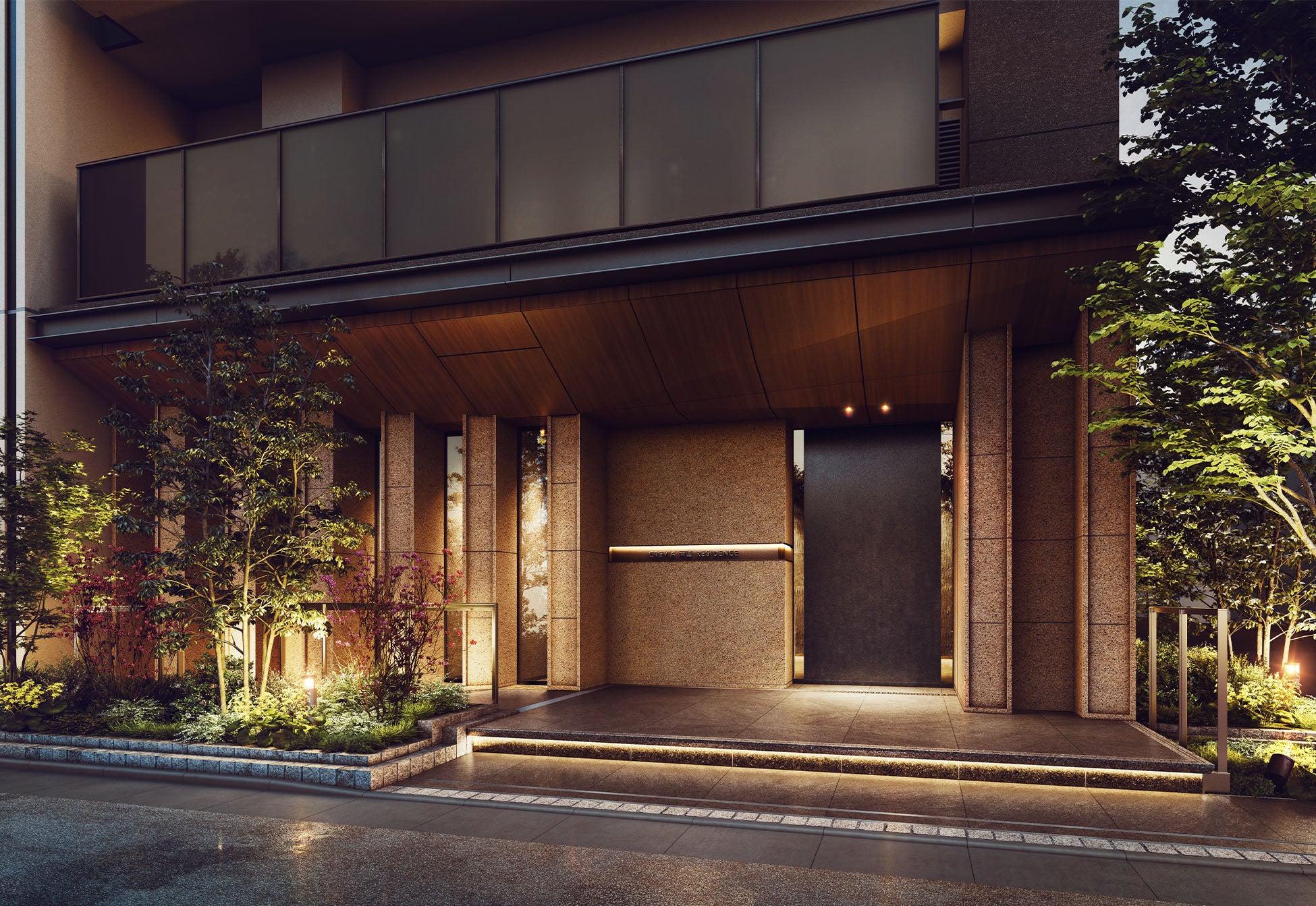 本物件は、古き良き江戸文化を感じられる両国の街並みになじむような風格あるデザインを目指しました。外観はダークトーンを基調に、落ち着いた色合いと質感で統一した錆石風の意匠素材を採用し、エントランスファサードはシンプルな中にもシックな雰囲気を演出。二方接道の沿道は四季折々の植栽で彩り、穏やかな街並みに緑豊かな景観を創出します。