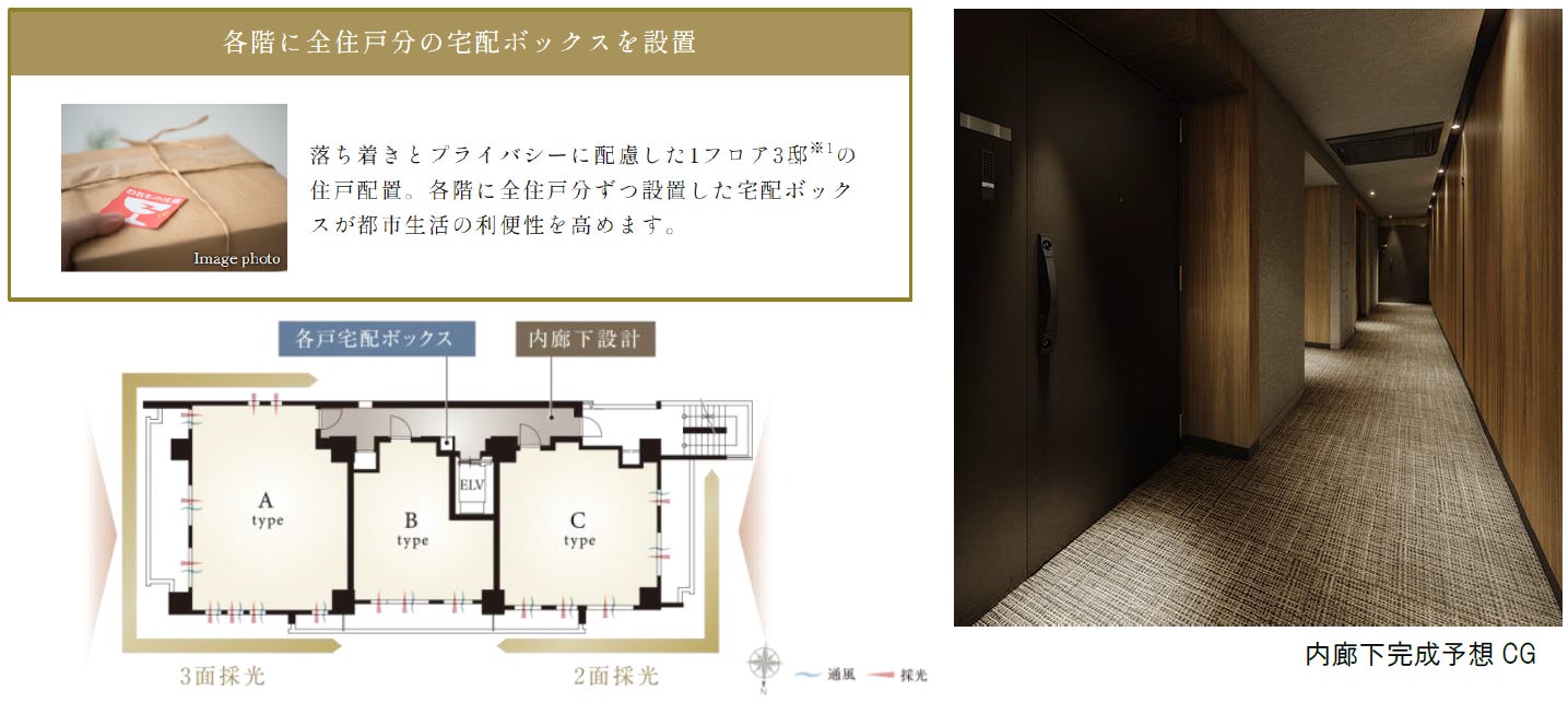 ■1フロア3邸(最上階のみ2邸)、各階に全住戸分の宅配ボックス設置