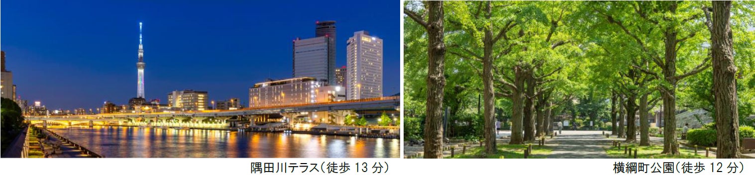 周辺には、国技館通り商店会や横綱横丁などの活気ある商業施設や飲食店をはじめ、隅田川テラスや横綱町公園、旧安田庭園など、静かにくつろげるスポットがあり、都心近接でありながら、緑豊かな落ち着いた住環境が享受できます。