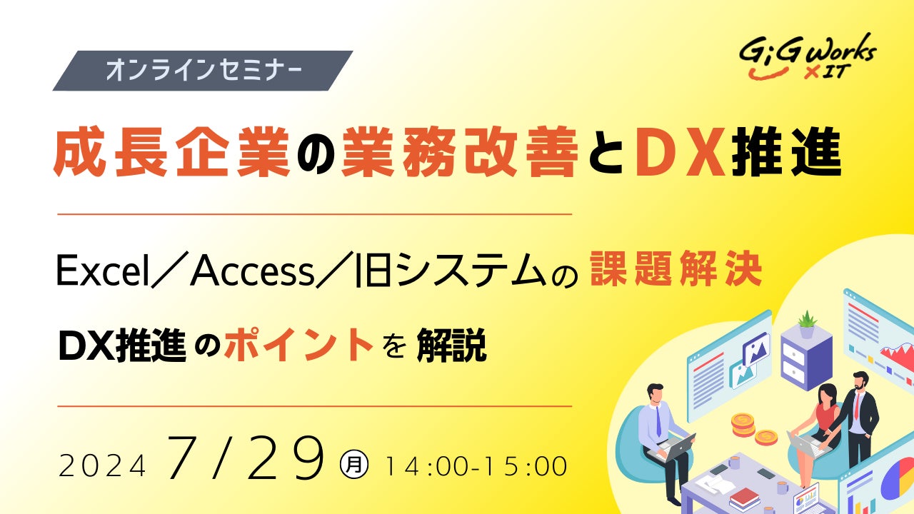ギグワークスクロスアイティ株式会社(ギグワークス株式会社(東証スタンダード 2375)子会社 本社:東京都港区、代表取締役:小島正也、以下ギグワークスクロスアイティ)は、『成長企業の業務改善とDX推進 ~Excel/Access/旧システムの課題解決~』をテーマとしたオンラインセミナーを開催し、中小企業・中堅企業に向けてDXの推進で着実に成果を上げる方法をご紹介します。