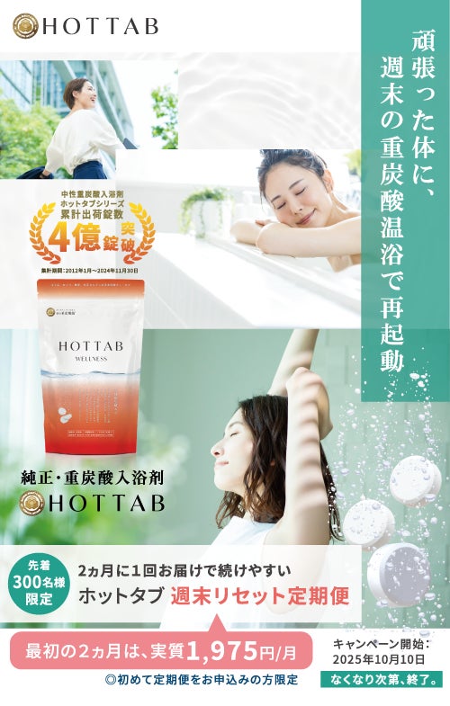 純正重炭酸入浴剤の製造特許技術を保有する、重炭酸の開発元であり、業界のパイオニアとして多くのメーカーにもOEM提供する、株式会社ホットアルバム炭酸泉タブレット(本社:東京都八王子市、代表取締役社長:小星重治)は、「がんばった体に週末ご褒美の超回復を!」をテーマとした、経済的にお得な2か月おきの定期便プラン「ホットタブ 週末ONZENリセット定期便」を、2025年10月10日(金)より開始します。