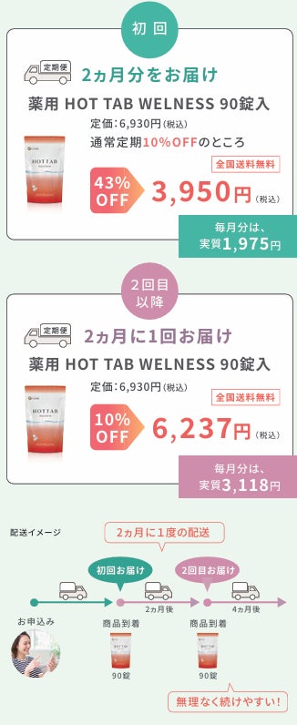 物価高騰のおり、「疲労を取り、体調を整えるだけは諦めたくない」という想いに応え、週末スマホなど見ながら、お風呂に30分入れる方、追い焚きのある方に向け、なるべく経済的な負担のない2ヵ月に1回お届け、初回は実質1,975円/月、以降も3,118円/月で週末リセットで疲労回復十分、と始めやすく、続けやすい価格設定の隔月お届けサイクルに特化したエントリー定期便モデルを開始します。