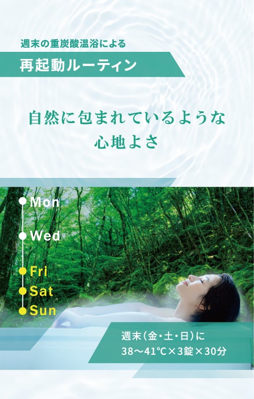 寒い冬に向け、今から“ぬるめのお湯に30分”で疲労を取って体調を整え、超回復の重炭酸週末入浴リセット習慣をご提案します。