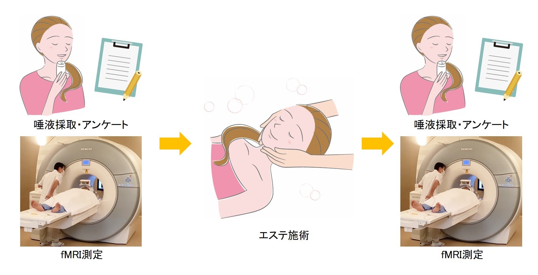 健常人女性23名(平均35歳)を対象に、エステセラピストが顔、デコルテを中心としたフェイシャルエステを行い、施術前後に心理評価のためのアンケートと唾液採取、および安静状態でfMRIの測定を実施しました(図1)。fMRIの脳画像は名古屋大学 脳とこころの研究センターに設置されている3T MRI装置(Siemens社製Verio)で取得しました。