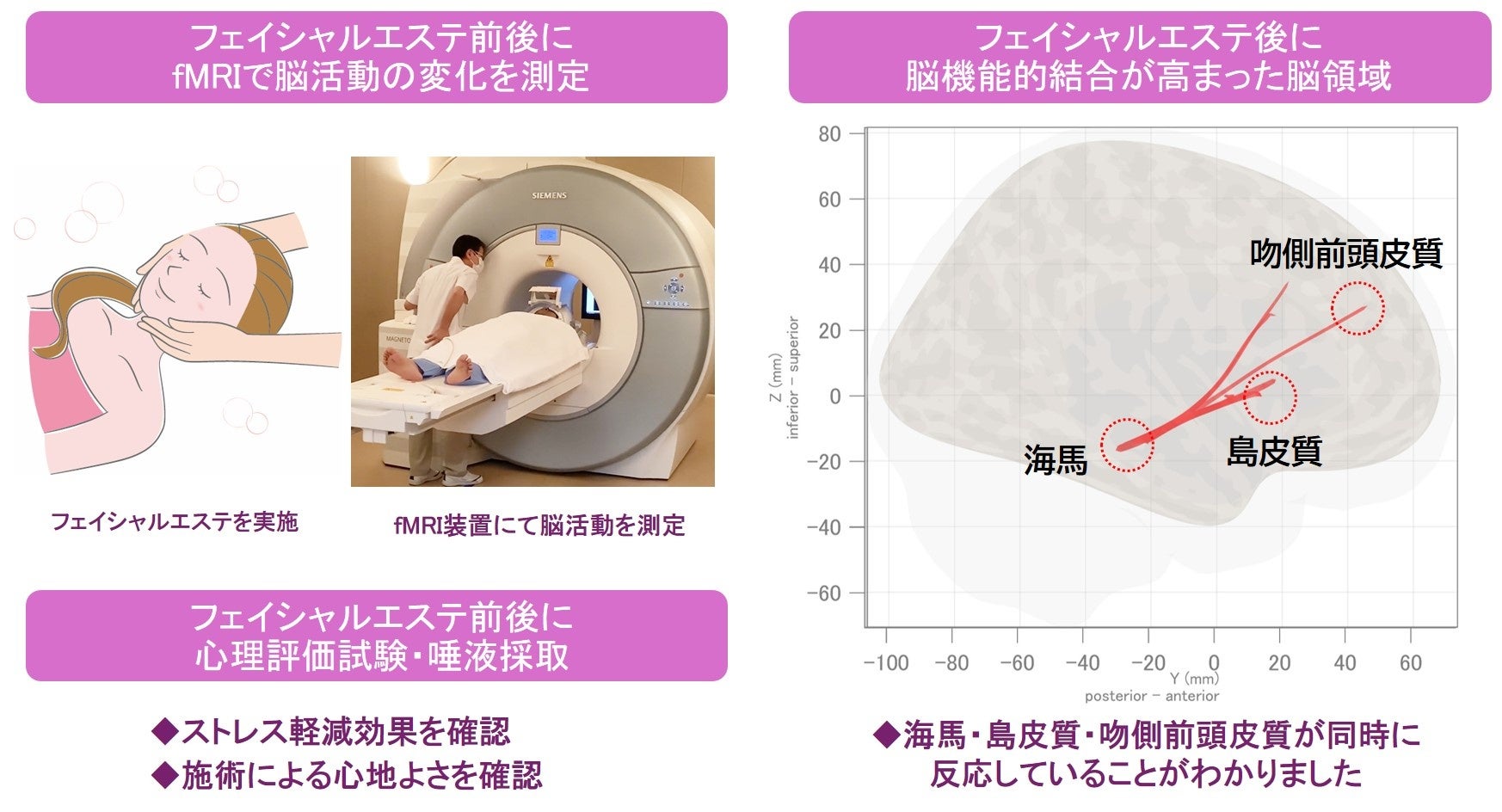 健常人女性23名に対してフェイシャルエステを行い、施術前後の心理状態と、fMRI※1を用いて脳活動を測定しました。その結果、フェイシャルエステによって心地よさが高まり、ストレスが軽減し、またこの時、特定の脳領域同士の連動性(脳機能的結合)が高くなっていることがわかりました。これらの結果から、フェイシャルエステの施術が脳に作用し、心地よさやストレス軽減をもたらしていると考えられました。