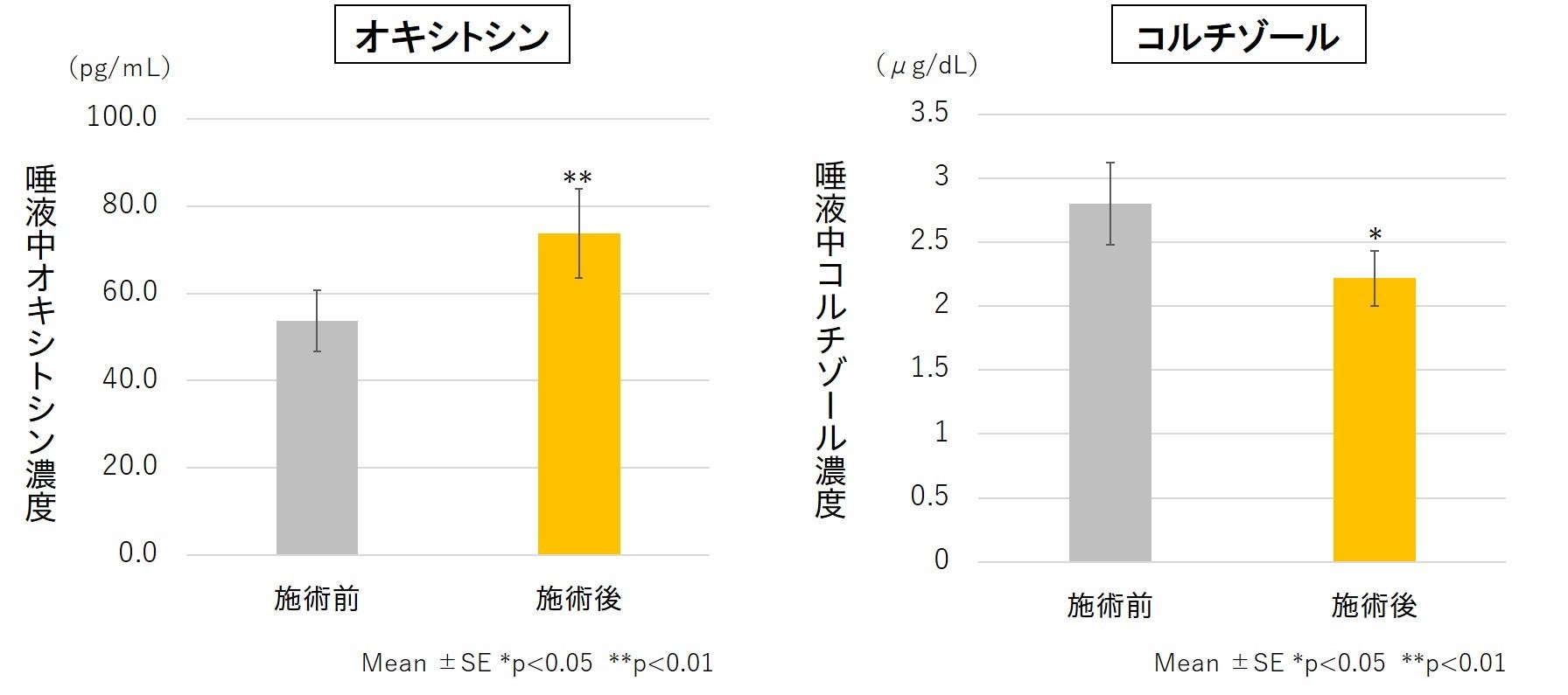 唾液中にはストレスや感情に反応して増減する特定のタンパク質が存在しており、これらを測定することでその時の心理状態を評価することができます。本研究では、心地よさの指標としてオキシトシン※2、ストレスの指標としてコルチゾール※3を測定しました。その結果、フェイシャルエステ後にオキシトシンが増加し、コルチゾールが低下しました(図3)。