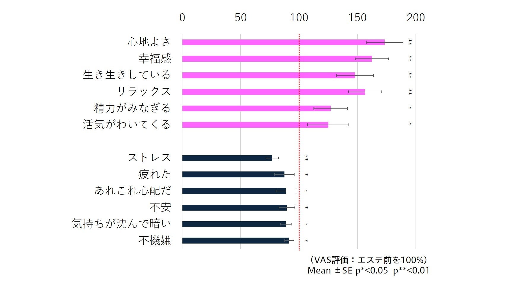 フェイシャルエステによって、『心地よさ』、『幸福感』、『リラックス』といったポジティブな感情が高まり、『ストレス』や『疲れた』などのネガティブな感情が軽減することがわかりました(図2)。