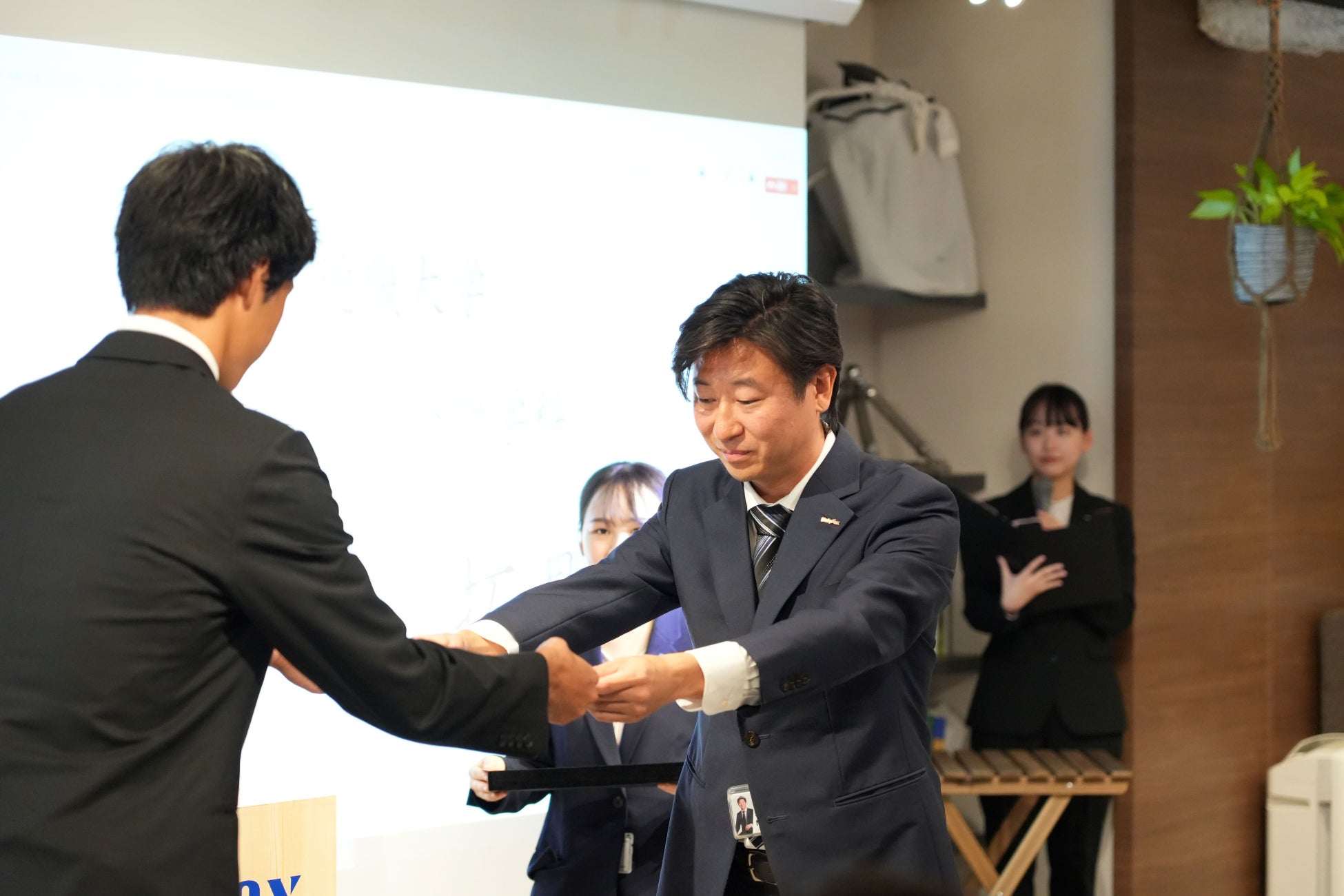 2025年4月に入社予定の新卒内定者20名(男性12名、女性8名)と代表取締役社長の能村と取締役3名が参加した式典では、内定者代表から入社後の抱負を宣言し、入社に向けた思いを役員に届けました。能村社長からは、内定者一人一人へ内定証書の授与と祝辞が送られました。