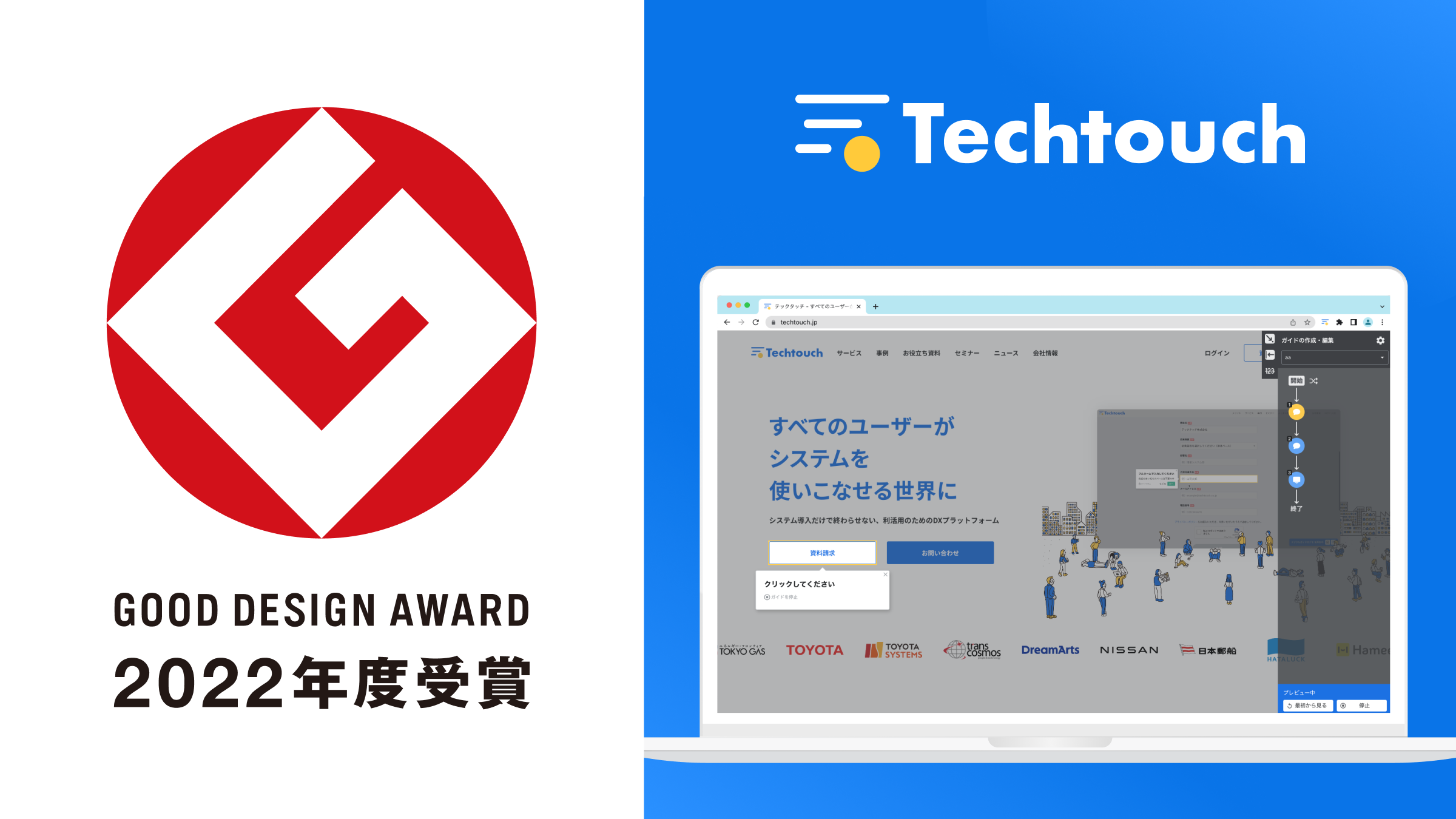 ノーコードでガイド・ナビゲーションを設置可能なSaaS「テックタッチ」(https://techtouch.jp/)を開発・提供するテックタッチ株式会社(本社:東京都千代田区、代表取締役:井無田仲、以下、当社)は10月7日、自社で開発するシステム「テックタッチ」が、2022年度グッドデザイン賞(主催:公益財団法人日本デザイン振興会)を受賞したことをお知らせします。誰でも直感的に操作ができるUIを実現したことが認められ、受賞となりました。