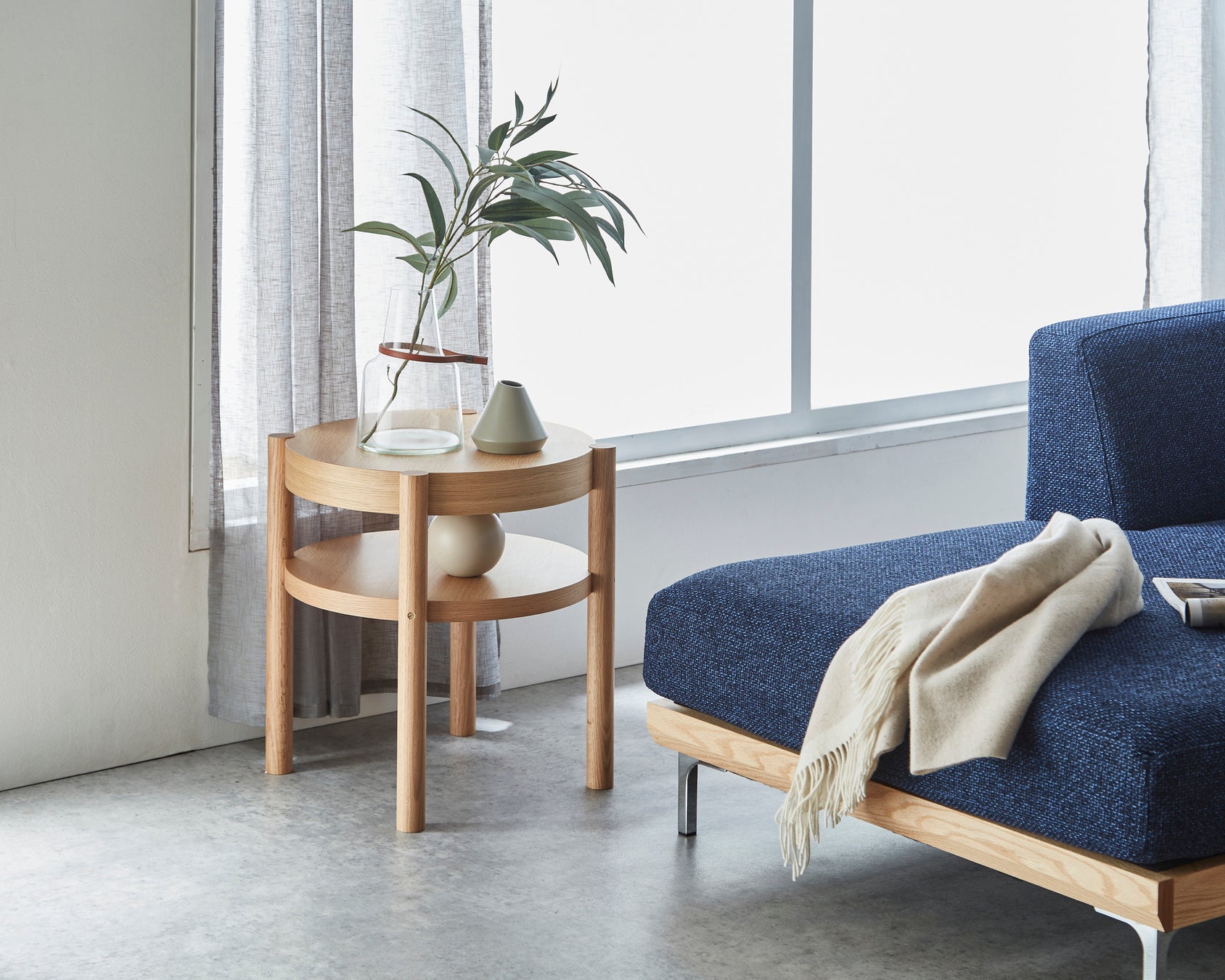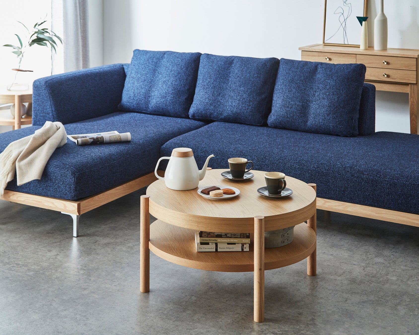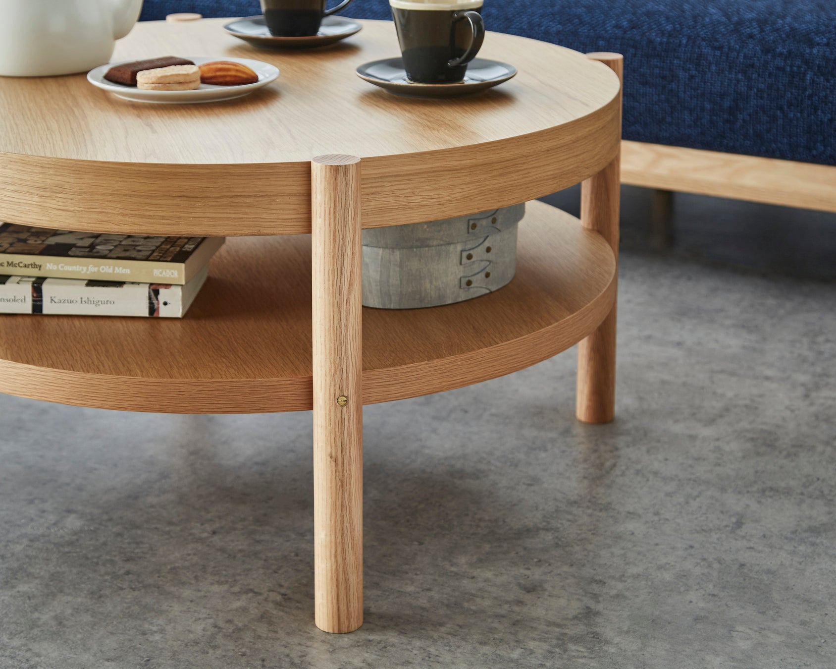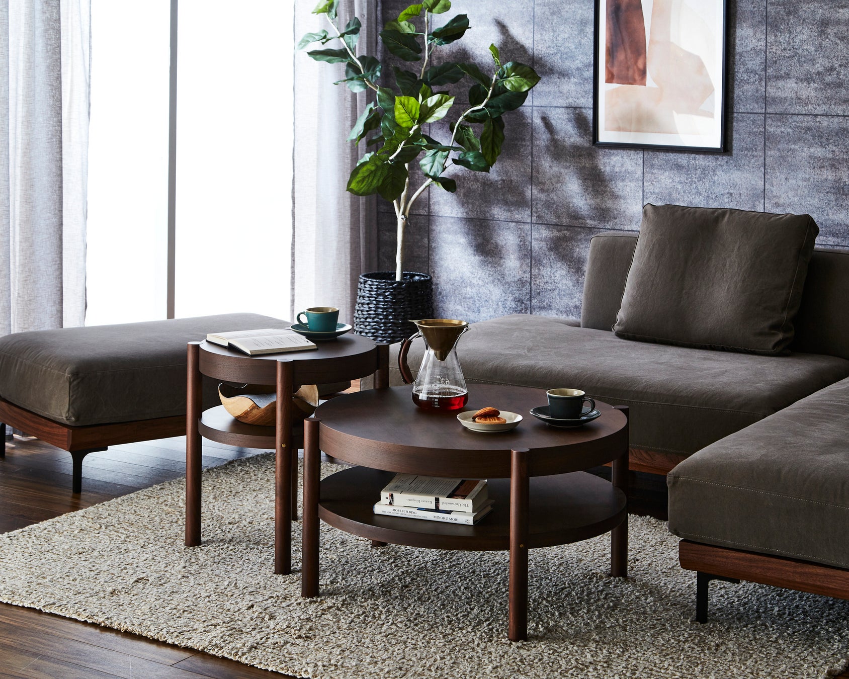 シリンダシリーズは、丸型の天板を2枚もちいたデザインで設計したモデルです。サイズは、76センチ幅のセンターテーブルと49センチのサイドテーブルの2パターン、素材は、ウォールナット、オークの2色から選ぶことができます。
