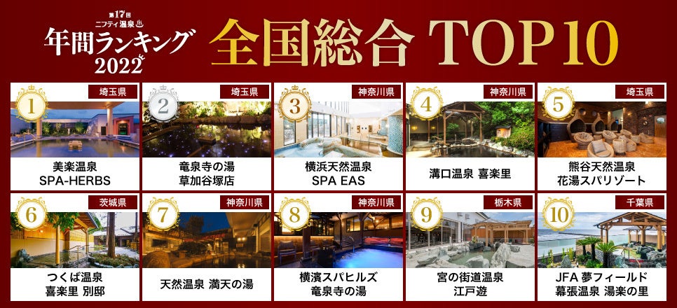 【ニフティ温泉】「SPA-HERBS(埼玉県)」が見事3連覇達成!お風呂好き大注目の「第17回 ニフティ温泉 年間ランキング2022」結果発表