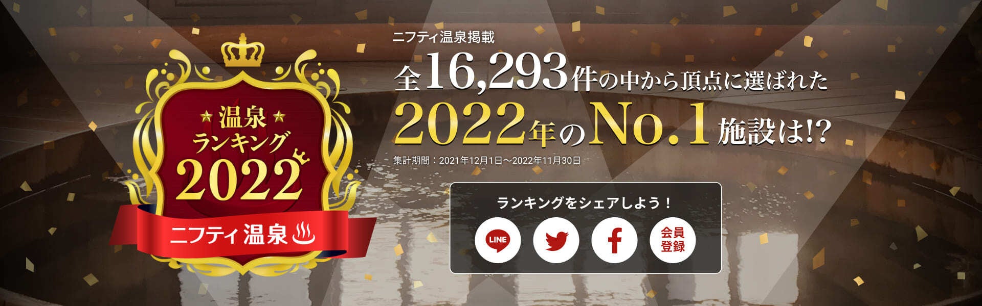 「ニフティ温泉 年間ランキング」は、「ニフティ温泉」に掲載された全国16,293件(2022年11月30日現在)の温泉・温浴施設を、施設紹介ページの閲覧件数やクチコミ評価、クーポンの利用状況、ユーザー投票等の独自の視点からランキング形式で発表するものです。特に今年で4回目の実施となるユーザー投票では、過去最高の19万3,200票が集まりました。