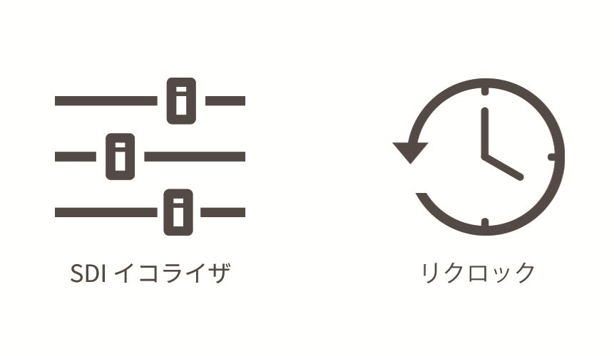 入力信号はSMPTE規格に準拠した3G/HD/SD-SDIの信号に対応します。※2) また、SDI出力端子側にはドライバチップを搭載。入力されたSDI信号をドライバチップによりクロック補正とリタイミング処理された状態で信号出力します。
