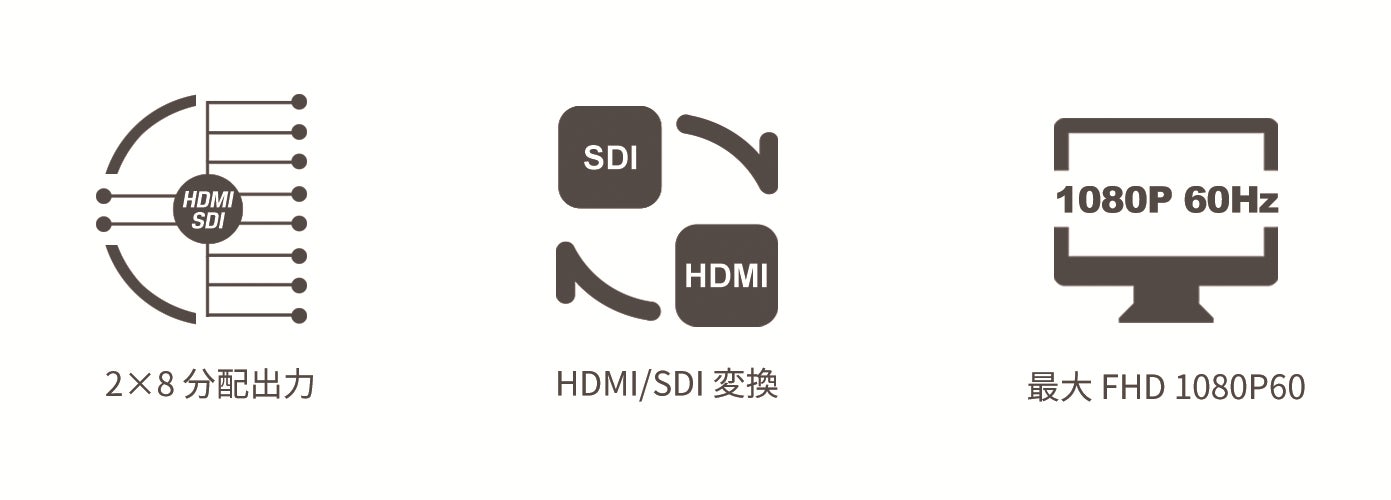 入力された3G/HD/SD-SDI信号またはHDMI信号の任意の入力信号を、SDI 4系統及びHDMI 4系統から同時に分配出力するSDI/HDMI分配器です。※1) SDIとHDMIが複数系統混在するシステムで重宝します。