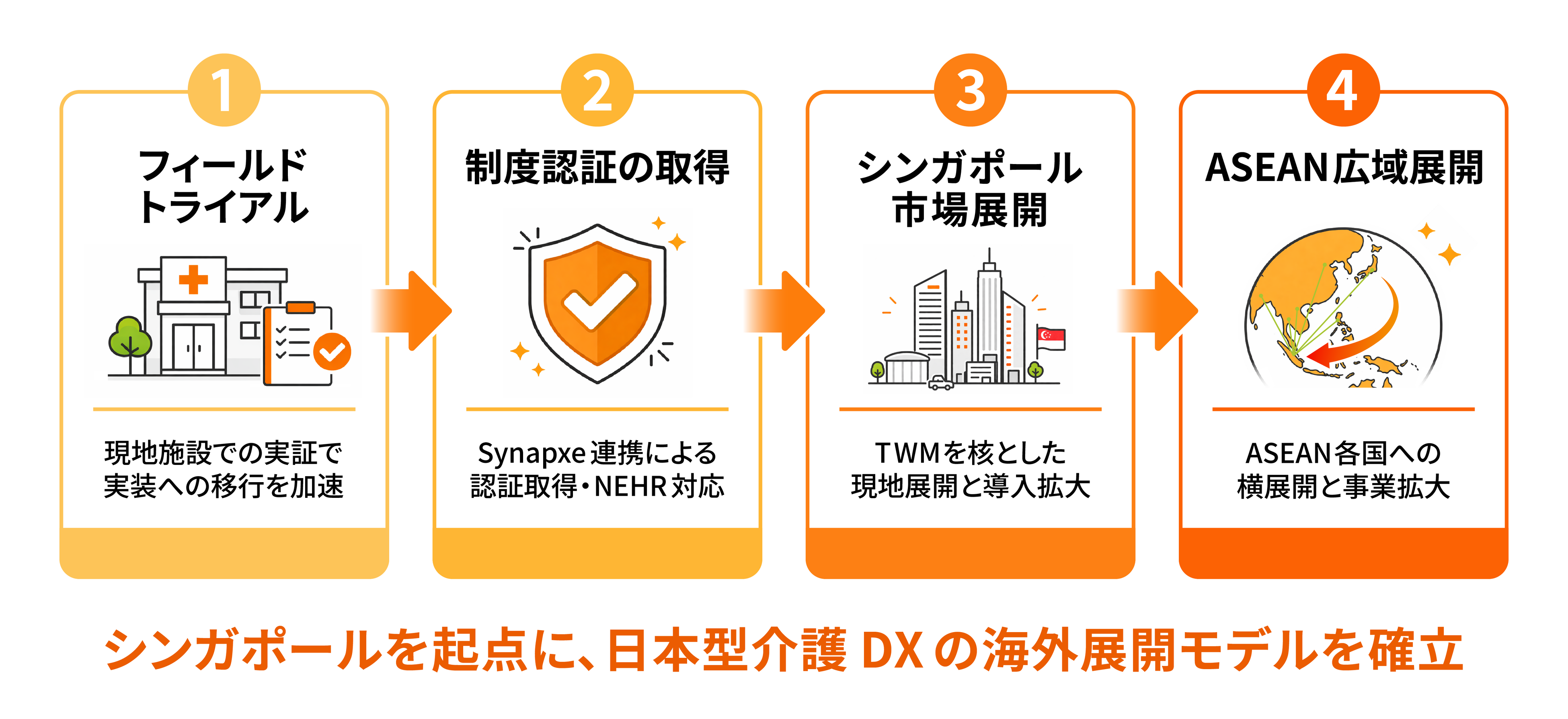 TWM社を核とした現地の営業・導入・運用体制のもと、シンガポール国内での導入実績を積み上げ、「日本型介護DXの海外成功モデル」を構築します。