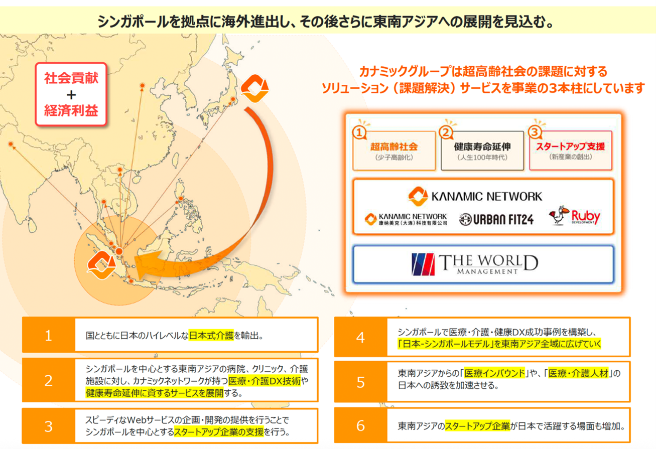 本事業を通じて、当社は日本の先進的な医療・介護・健康分野のDXモデルがシンガポールに適用可能かつ有用であることを検証し、将来的にはシンガポールを拠点としてASEAN地域全体(マレーシア、タイ、ベトナムなど)への展開を目指してまいります。これにより、ASEAN各国が直面する超高齢社会における医療・介護人材不足や医療費増大といった社会課題の解決に貢献し、日本の医療・介護産業の国際競争力強化に寄与してまいります。