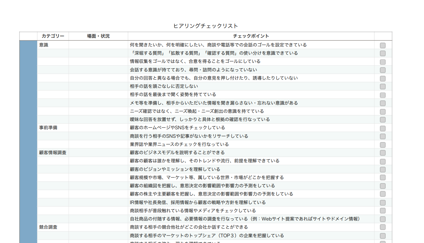 ヒアリングで意識すべきこと、やるべきことをチェックリストとしてまとめました。商談前ー商談中ー商談後を網羅し項目は179個。ぜひ、ヒアリングスキルを高め、営業力のアップにご活用くださいませ。