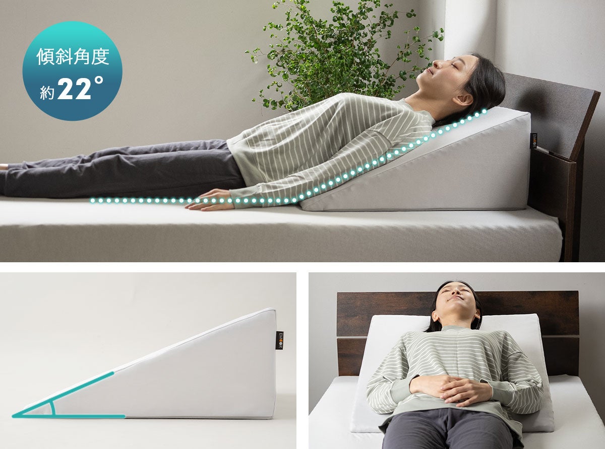 22°の快適な傾斜角度と高品質素材により、快適な寝姿勢やリクライニング姿勢を自然にサポートする傾き寝枕です。上半身を少し高くしたリラックスした状態で睡眠できます。