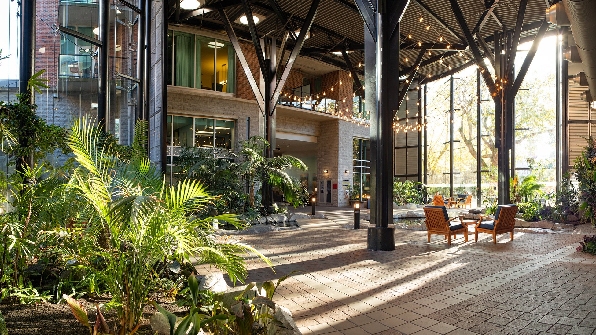 ビクトリアのダウンタウンに位置するエココンシャスなオアシス、ザ・パークサイド・ホテル&スパは、歴史的なクリスタルガーデンから移設された緑豊かなアトリウムでお客様を迎え、街の文化遺産を守りながら、リラックスできる空間を提供しています。ホテルの外観は、赤レンガとセメントを基調に、周囲の建物と調和しつつ、セント・アンズ・アカデミーなどの近隣ランドマークを引き立てています。また、雨水を収集し、ホテルの中水タンクに再利用するシステムが組み込まれています。2019年以降、ホテルは「ビーズ・プリーズ・ファーム」と提携し、屋上でミツバチの巣箱を維持し、都市の生物多様性を支援しています。さらに、屋上にはスタッフガーデンがあり、古いカーテンを再利用して作られたトートバッグを宿泊客に提供するなど、ユニークなアップサイクル活動にも取り組んでいます。