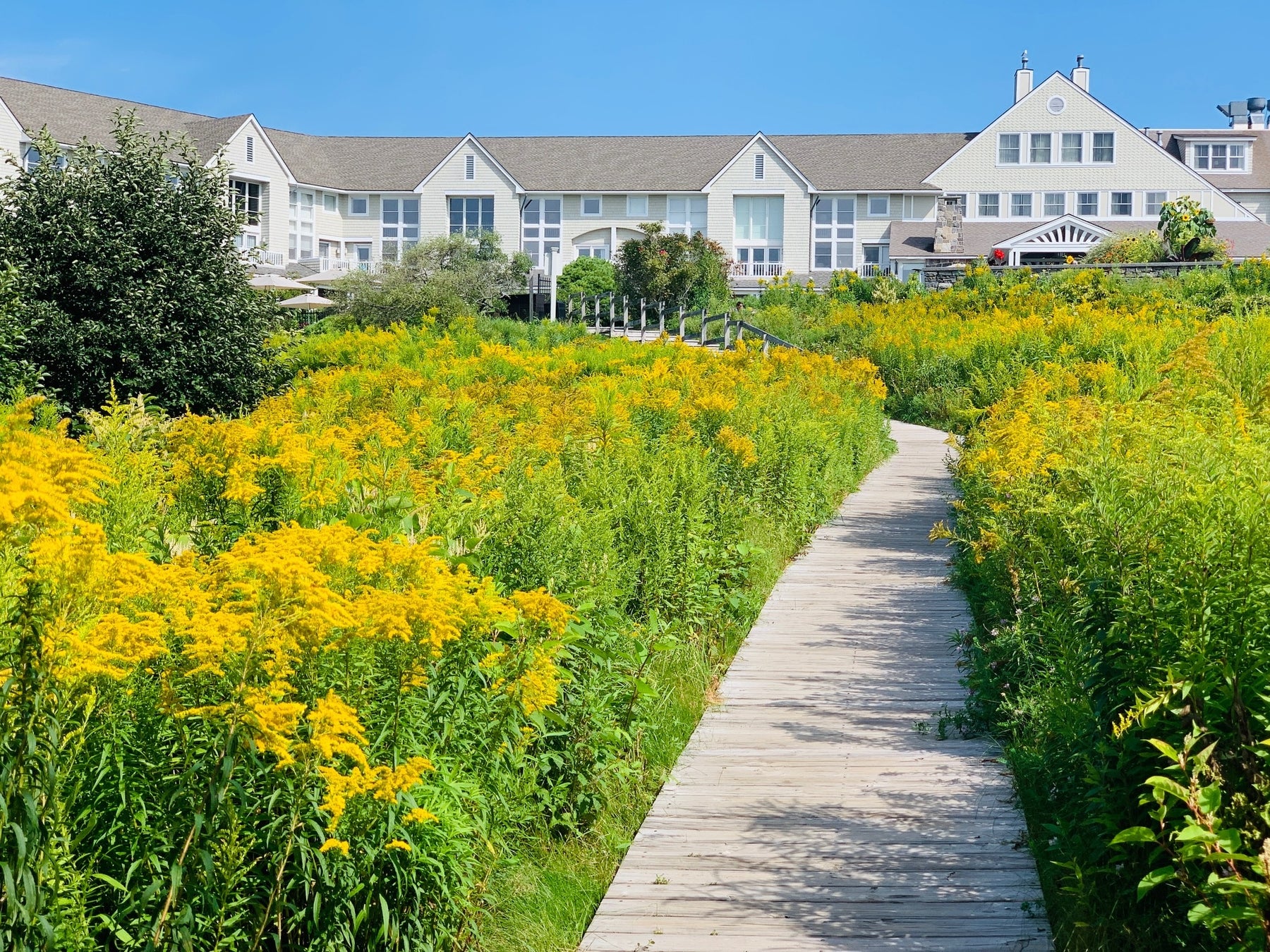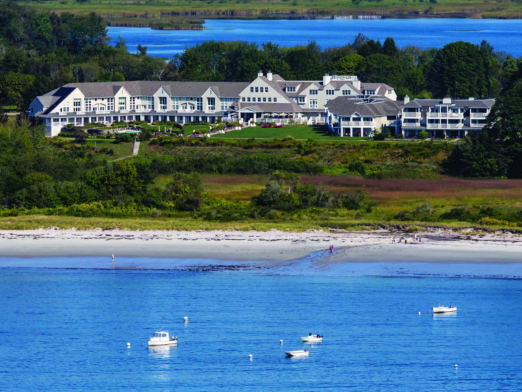 イン・バイ・ザ・シーは、ニューイングランド沿岸の伝統と現代的なテイストを融合させた生物親和的デザインを採用し、ゲストと自然界を深く結びつけています。ロビーからのパノラマビューは、昔ながらの庭園から大西洋まで広がり、床から天井まである窓を通して自然光が豊かに注がれます。木造の外観と石造りの壁はニューイングランドの伝統的な建築様式を反映しており、周囲の景観は原生植栽や復元された海岸沿いの牧草地、活気に満ちたショーガーデンなどで構成されています。これにより地元の野生生物が支えられ、自然の美しさが引き立てられています。環境に配慮した改修工事では、リサイクル素材を使用し、建設廃棄物を削減することで、SPAの増築部分においてLEEDシルバー認証を取得し、持続可能性への取り組みを強化しています。